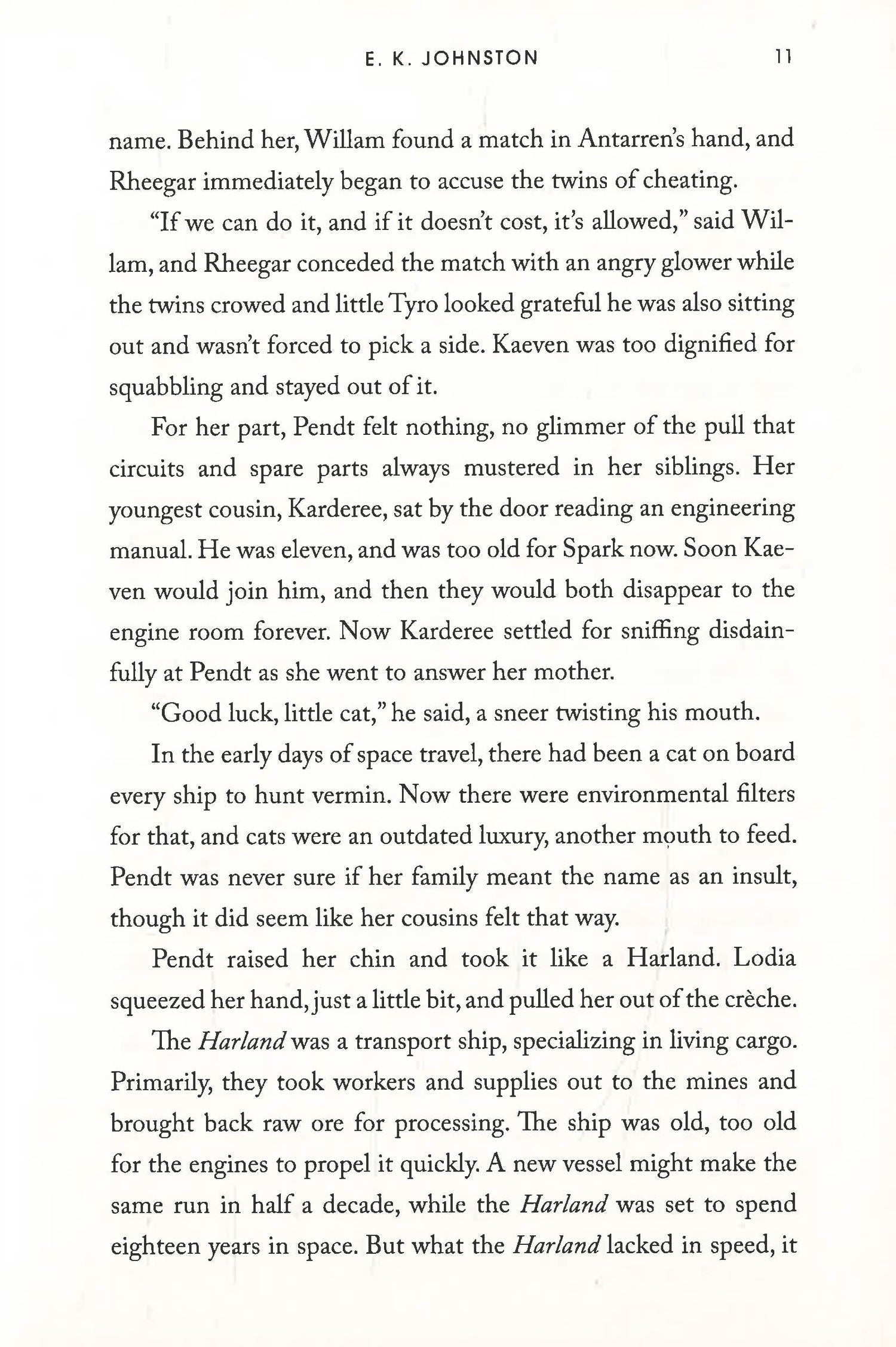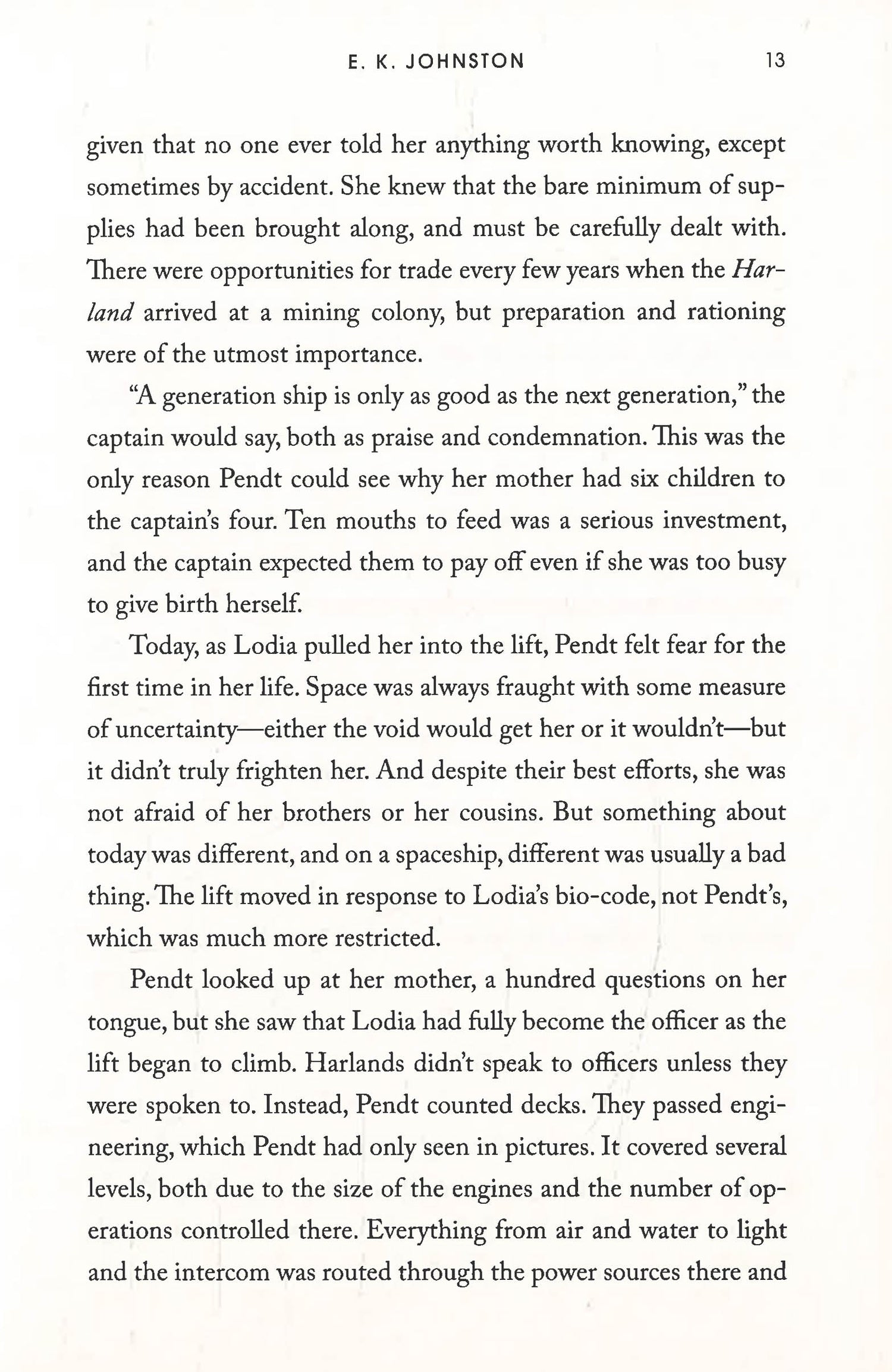 Set on a family-run interstellar freighter called the Harland and a mysterious remote space station, E. K. Johnston's latest is story of survival and self-determination.