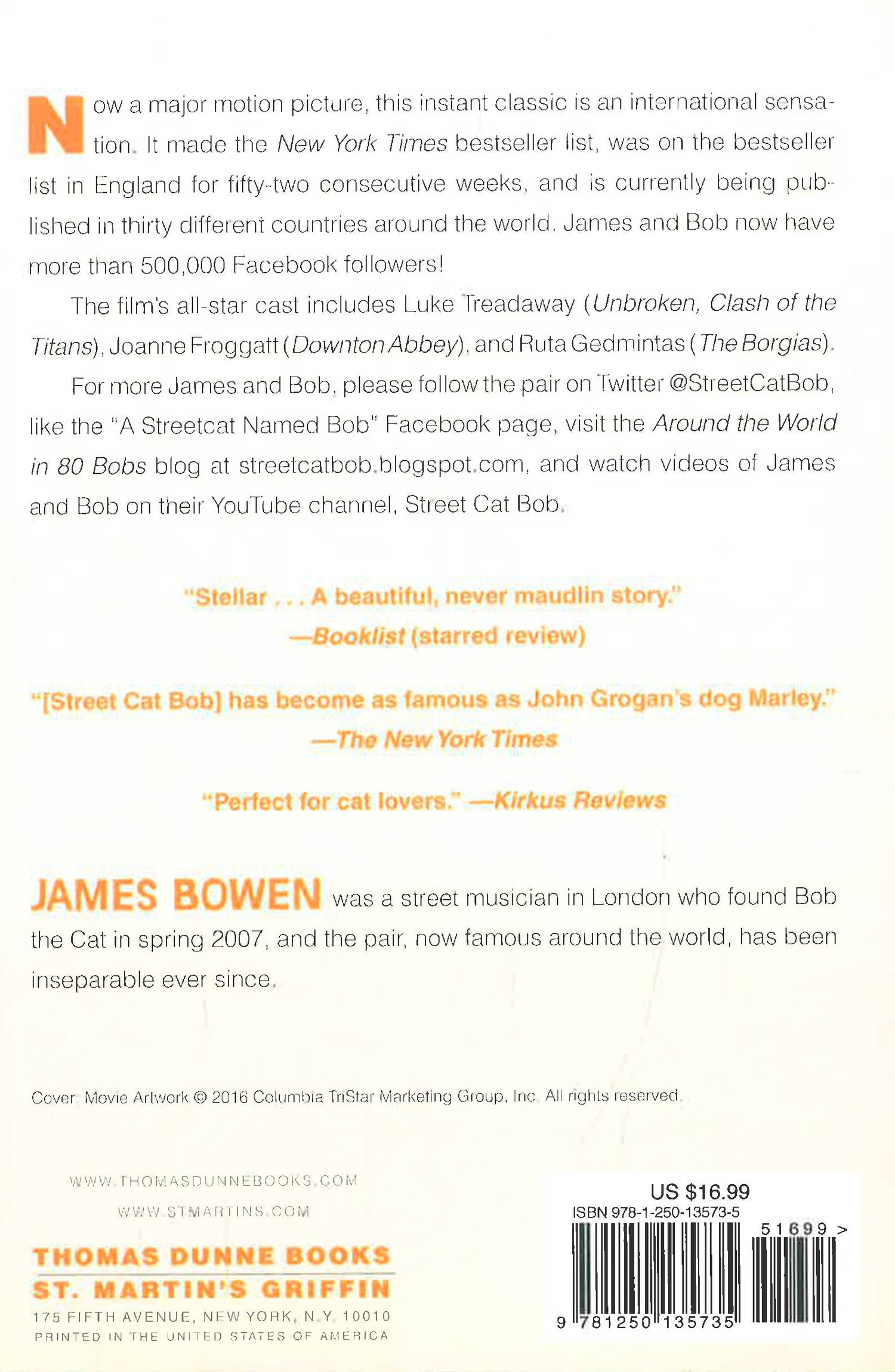 Now a major motion picture, this instant classic is an international sensation. It made the New York Times bestseller list, was on the bestseller list in England for 52 consecutive weeks, and is currently being published in 30 different countries around the world. James and Bob now have more than 500,000 Facebook followers!