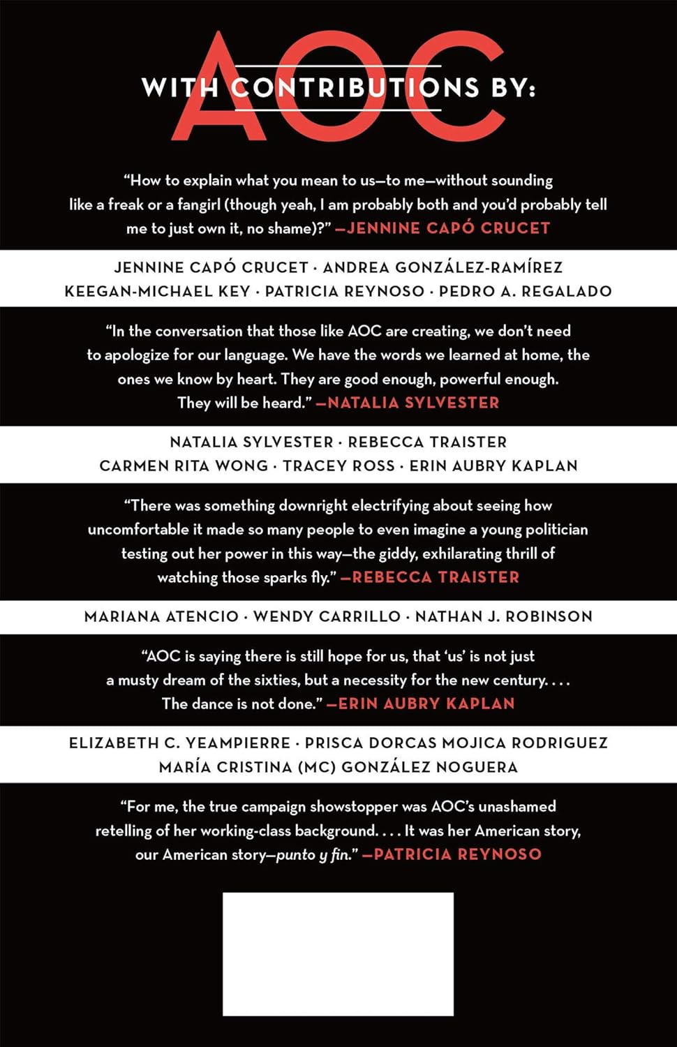 AOC investigates her symbolic and personal significance for so many, from her willingness to use her imperfect bi-lingualism, to why men are so threatened by her power, to the long history of Puerto Rican activism that she joins. Contributors span a wide range of voices and ages, from media to the arts and politics: