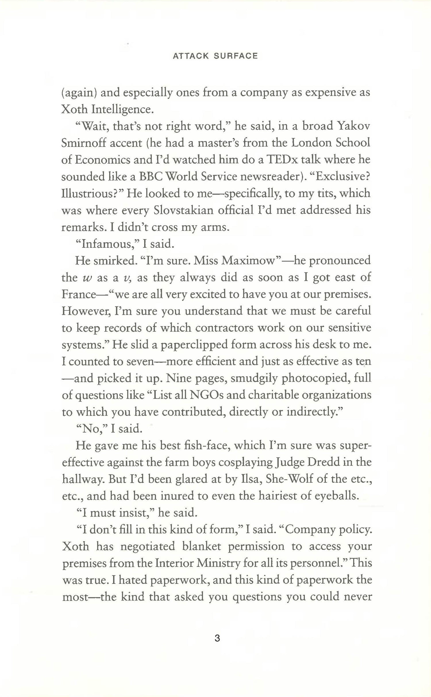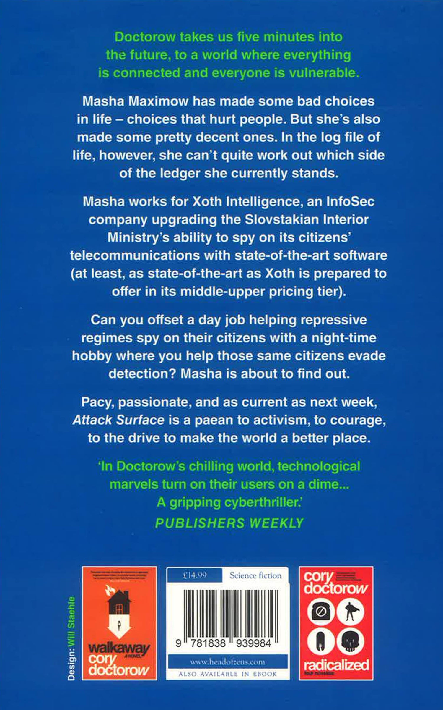 Returning to the world of Little Brother and Homeland, Attack Surface takes us five minutes into the future, to a world where everything is connected and everyone is vulnerable.Return to the world of Little Brother and Homeland. Attack Surface takes us five minutes into the future, to a world where everything is connected and everyone is vulnerable. Masha Maximow has made some bad choices in life – choices that hurt people. But she's also made some pretty decent ones. In the log file of life, however, she can't quite work out which side of the ledger she currently stands.Masha works for Xoth Intelligence, an InfoSec company upgrading the Slovstakian Interior Ministry's ability to spy on its citizens' telecommunications with state-of-the-art software (at least, as state-of-the-art as Xoth is prepared to offer in its middle-upper pricing tier).Can you offset a day-job helping repressive regimes spy on their citizens with a nighttime hobby where you help those same citizens evade detection? Masha is about to find out.Pacy, passionate, and as current as next week, Attack Surface is a paean to activism, to courage, to the drive to make the world a better place.Praise for Cory 'The right book at the right time from the right author – and, not entirely coincidentally, Cory Doctorow's best novel yet' JOHN SCALZI'A wonderful, important book ... I think it'll change lives' NEIL GAIMAN on Little Brother'One of our most important science fiction writers' KIM STANLEY ROBINSON