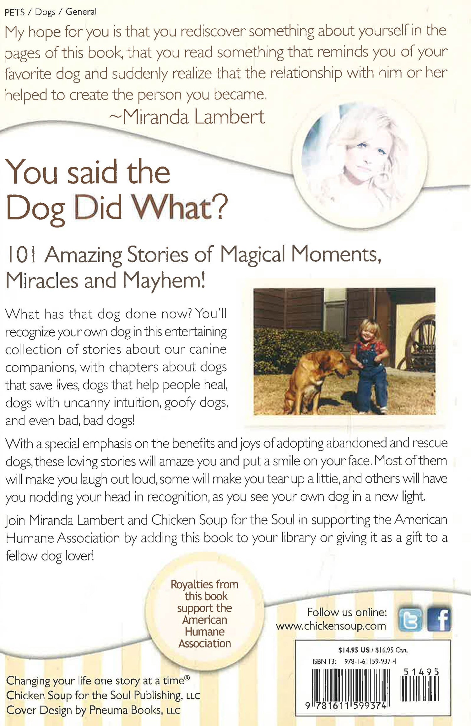 Join Miranda Lambert and Chicken Soup for the Soul in supporting the American Humane Association by adding this book to your library or giving it as a gift to a fellow dog lover.