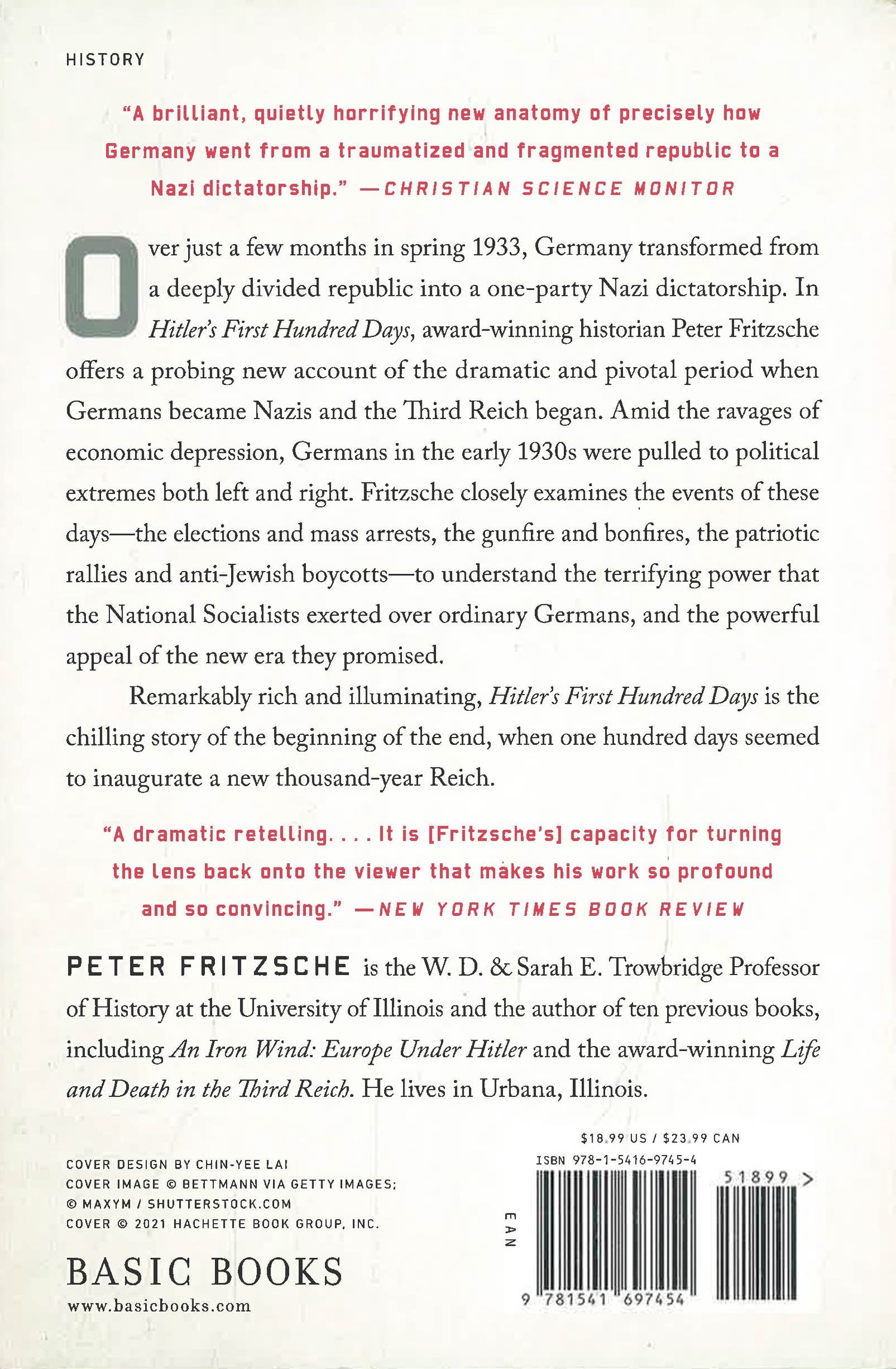 Amid the ravages of economic depression, Germans in the early 1930s were pulled to political extremes both left and right. Then, in the spring of 1933, Germany turned itself inside out, from a deeply divided republic into a one-party dictatorship. In Hitler's First Hundred Days, award-winning historian Peter Fritzsche offers a probing account of the pivotal moments when the majority of Germans seemed, all at once, to join the Nazis to construct the Third Reich. Fritzsche examines the events of the period--the elections and mass arrests, the bonfires and gunfire, the patriotic rallies and anti-Jewish boycotts--to understand both the terrifying power the National Socialists exerted over ordinary Germans and the powerful appeal of the new era they promised.