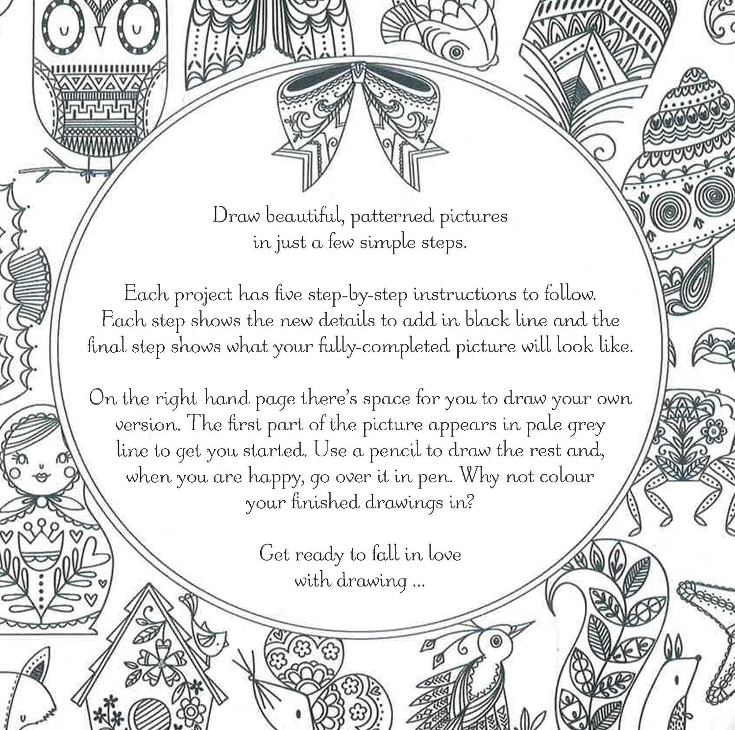Each page in this pocket format book features a drawing project, with a step-by-step guide on the left-hand page and a blank page on the right for drawing. With more than 60 projects, this book will keep the creative juices flowing, and teach readers how to draw beautifully decorative animals, patterns, and flowers.