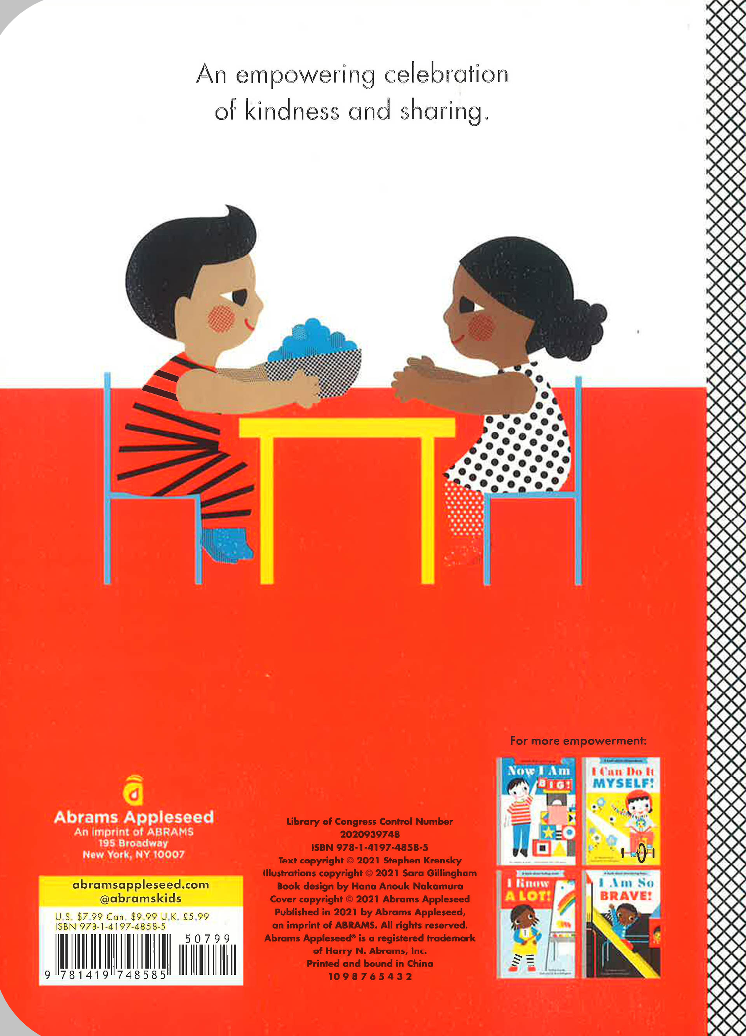This fifth book in the Empowerment series celebrates learning how to share. With relevant and charming specifics, Stephen Krensky and Sara Gillingham address the joy we feel from giving back. Young children and their parents will revel in the encouraging text and retro-fresh illustrations.