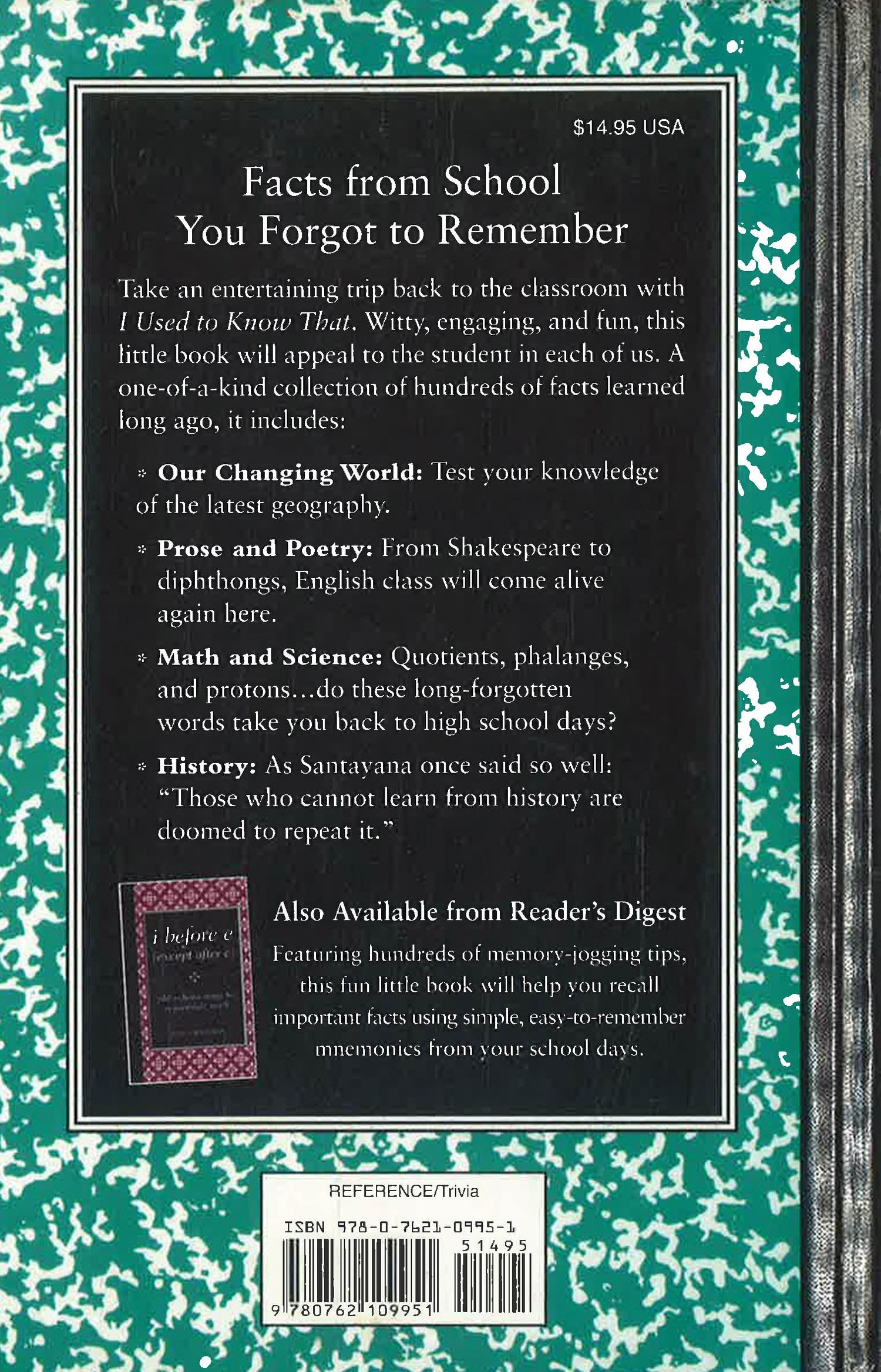 This small but mighty collection will trigger your memory with fun facts you learned in school-from adverbs to the Pythagorean Theorem. Witty, engaging, entertaining-a book you'll pick up again and again.