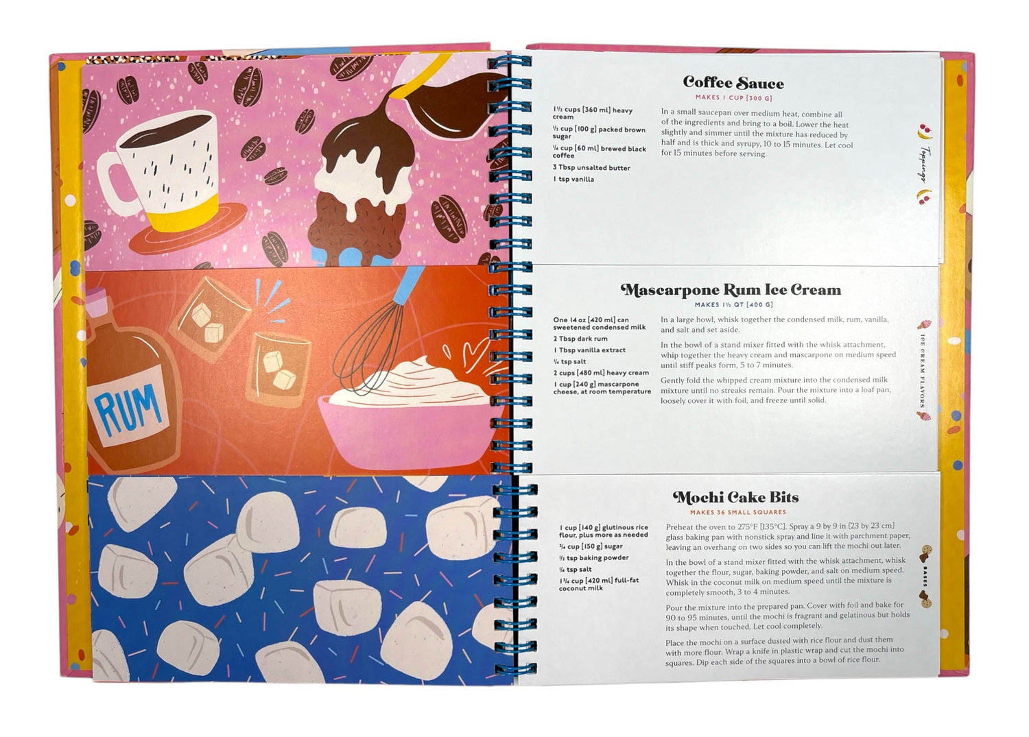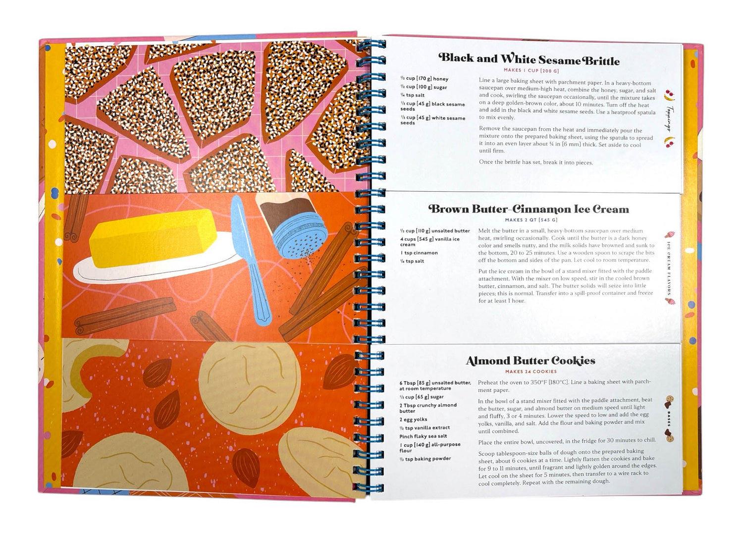 Each page is divided into thirds, making it easy to flip around and create a perfect combination for any moment. Featuring bright and colorful illustrations, and both classic and new flavors, including Coffee Toffee Ice Cream, Spiced Hot Fudge Sauce, Black and White Sesame Brittle, Cocoa Nib-Candied Ginger Ice Cream, and Buckwheat Brownies, there's something to satisfy every sweet tooth.