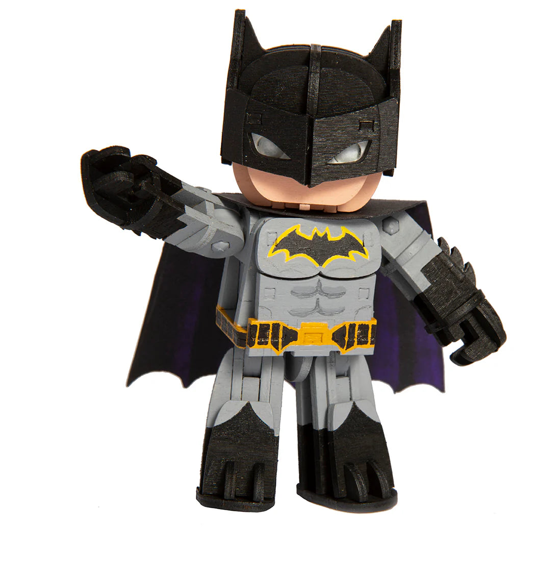 Now Batman fans can assemble their own Caped Crusader to fight crime with the build-it-yourself Batman model included in this IncrediBots kit! Made from natural wood, the model can be painted, colored, and customized to create a truly unique Batman figure. The included plastic joints and punch-out pieces are easy to assemble, snapping together to form a dynamic and movable 3D figure with five points of articulation.
