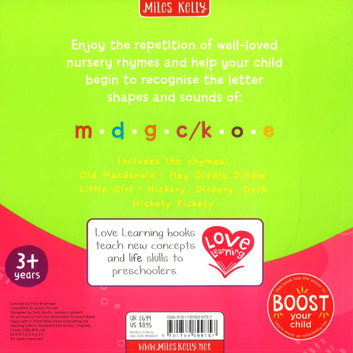 Start children on their reading journey with this brilliant book. Using the enjoyable repetition of familiar nursery rhymes, grown-ups can help children follow along and begin to recognise the letters m, d, g, c/k, o and e. Practice activities based around each letter will help to reinforce understanding. Written with, and consulted by, linguistics expert Susan Purcell, this book provides the perfect introduction for little ones to begin learning their letters. • Accompanied throughout by engaging illustrations • Part of our Love Learning initiative to introduce early concepts and life skills • Uses familiar nursery rhymes to teach children to recognise letters • Part of a 4-book series covering all 26 letters of the alphabet