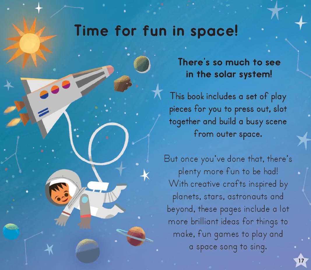 In this innovative new activity board book, children can assemble an out-of-this-world space scene. Featuring 20 unique designs such as astronauts, aliens and asteroids, the press-out pieces can be simply slotted together to create a host of intergalactic characters. After putting the pieces together, children can make their own asteroid cakes and get creative with crafts, including making a blast-off rocket and space wrapping paper.