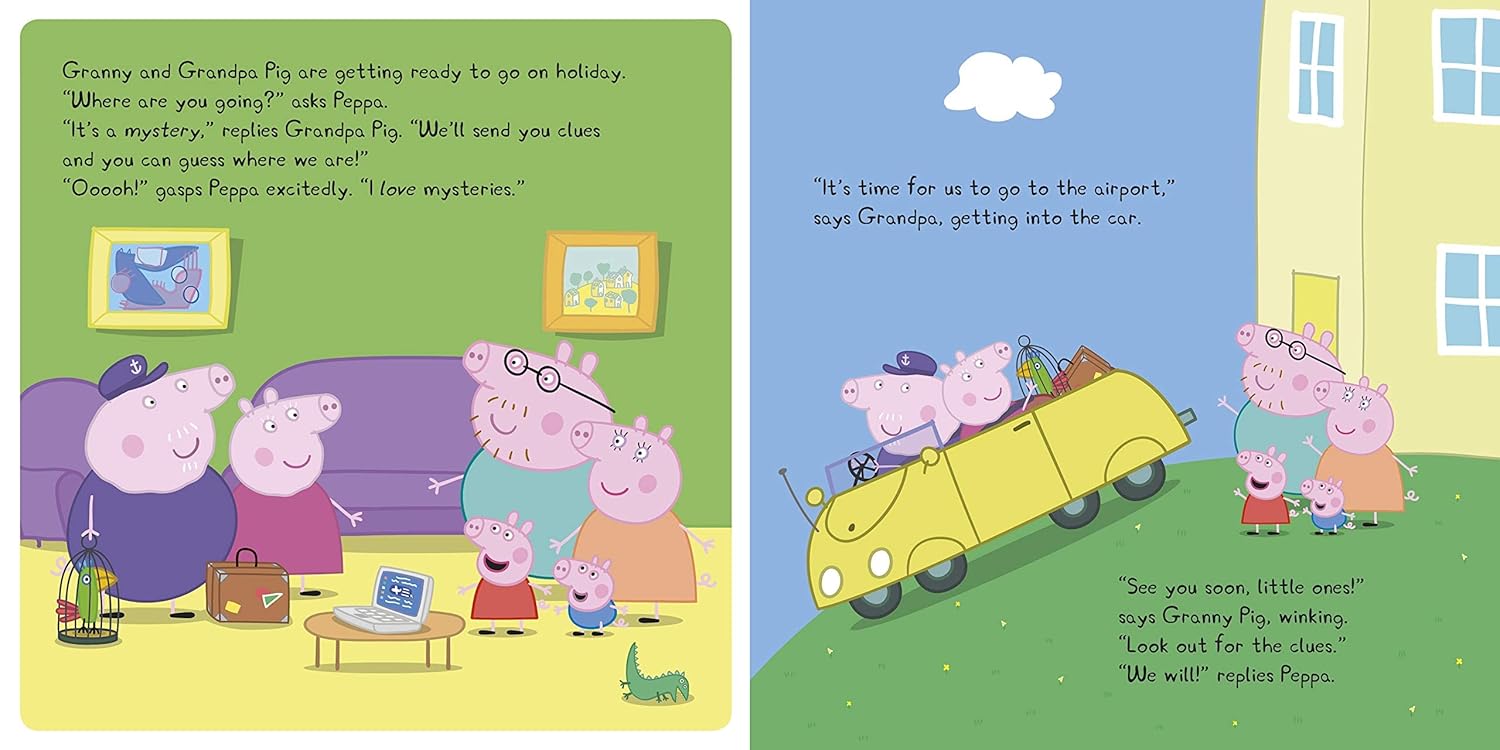 A brand-new picture book story with six envelopes containing clues to pull out to help Peppa and George solve the mystery of where Granny and Grandpa Pig have gone on their summer holiday!