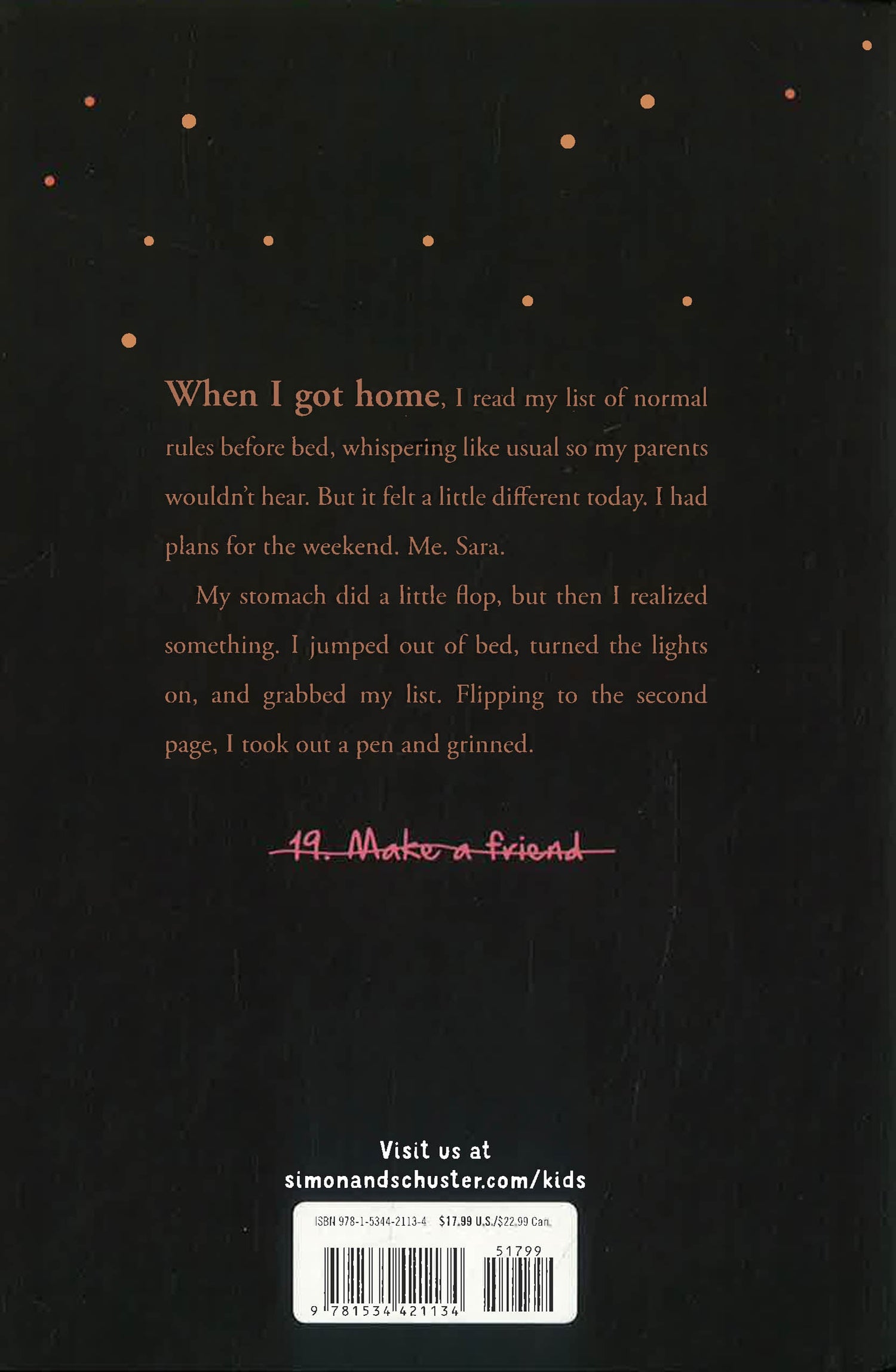 Sara wants one thing: to be normal. What she has instead are multiple diagnoses from Dr. Ring. Sara’s constant battle with False Alarm—what she calls panic attacks—and other episodes cause her to isolate herself. She rarely speaks, especially not at school, and so she doesn’t have any friends. But when she starts group therapy she meets someone new. Talkative and outgoing Erin doesn’t believe in “normal,” and Sara finds herself in unfamiliar territory: at the movies, at a birthday party, and with someone to tell about her crush—in short, with a friend. But there’s more to Erin than her cheerful exterior, and Sara begins to wonder if helping Erin will mean sacrificing their friendship.