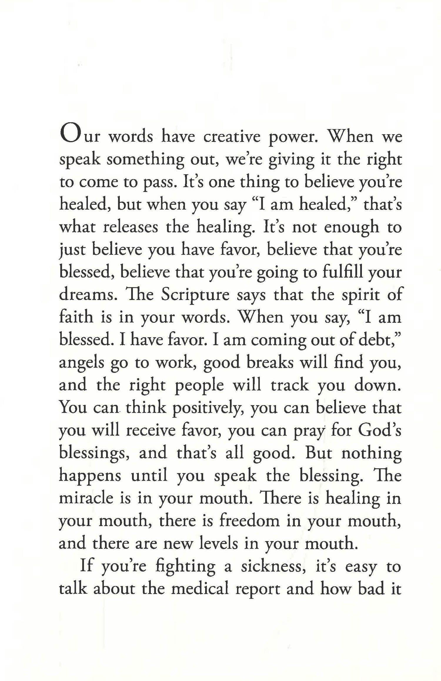 In Speak the Blessing, New York Times bestselling author Joel Osteen offers you unique insights into this profound truth: Your words have creative power. When you discover the power of speaking what God says about you, you give those words the right to come to pass. There is a miracle in your mouth. There is healing in your mouth, freedom in your mouth, and new levels in your mouth. But nothing happens until you speak the blessing.