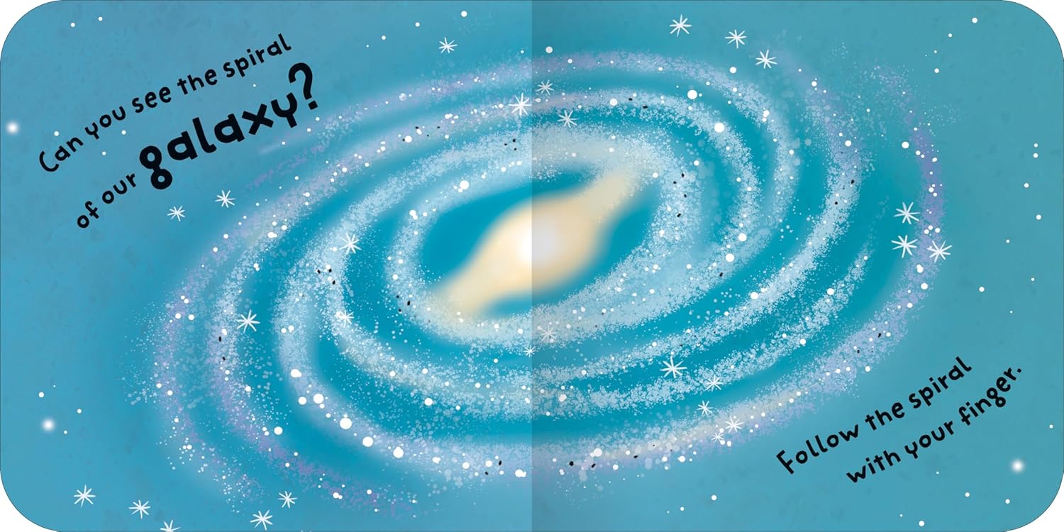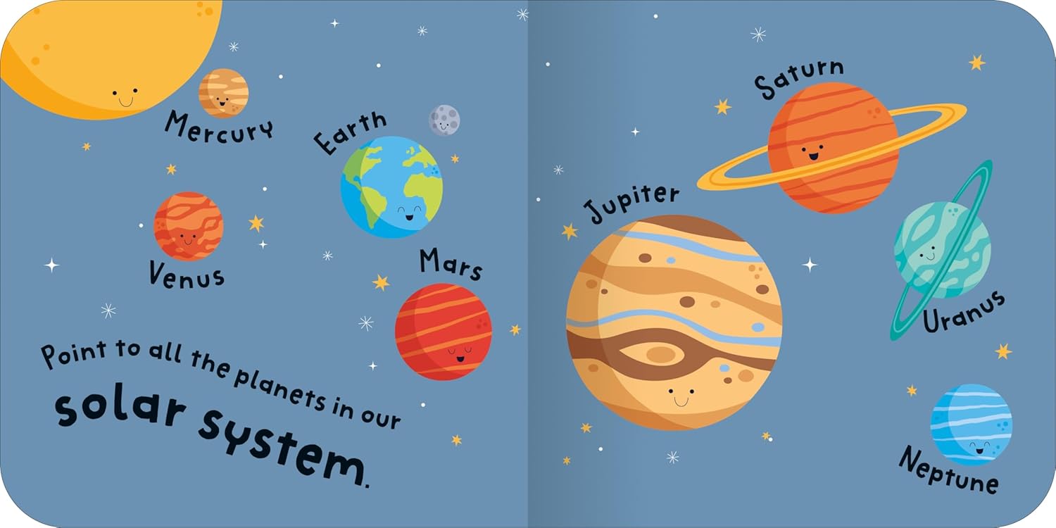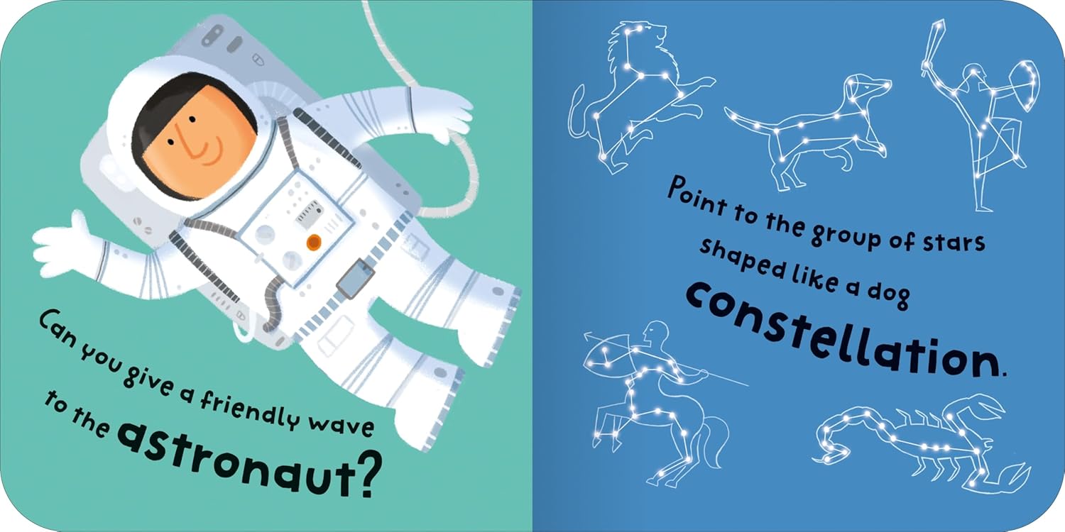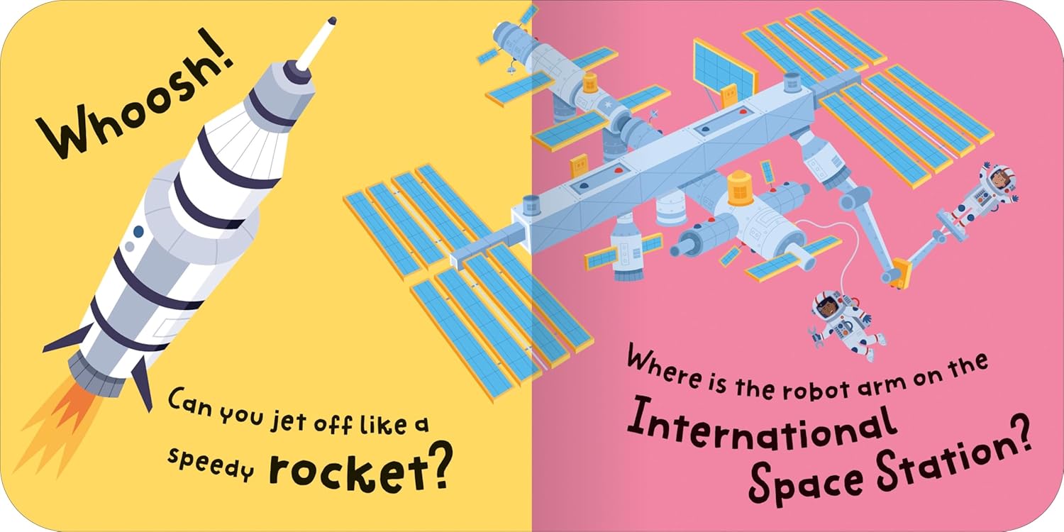 Spot and Do: Space is a wonderful early years board book. Each page features a different space object and encourages your child to answer a question or interact with the page in some way. For example 'Can you jet off like a speedy rocket?' and 'Where is the robot arm on the International Space Station?'.