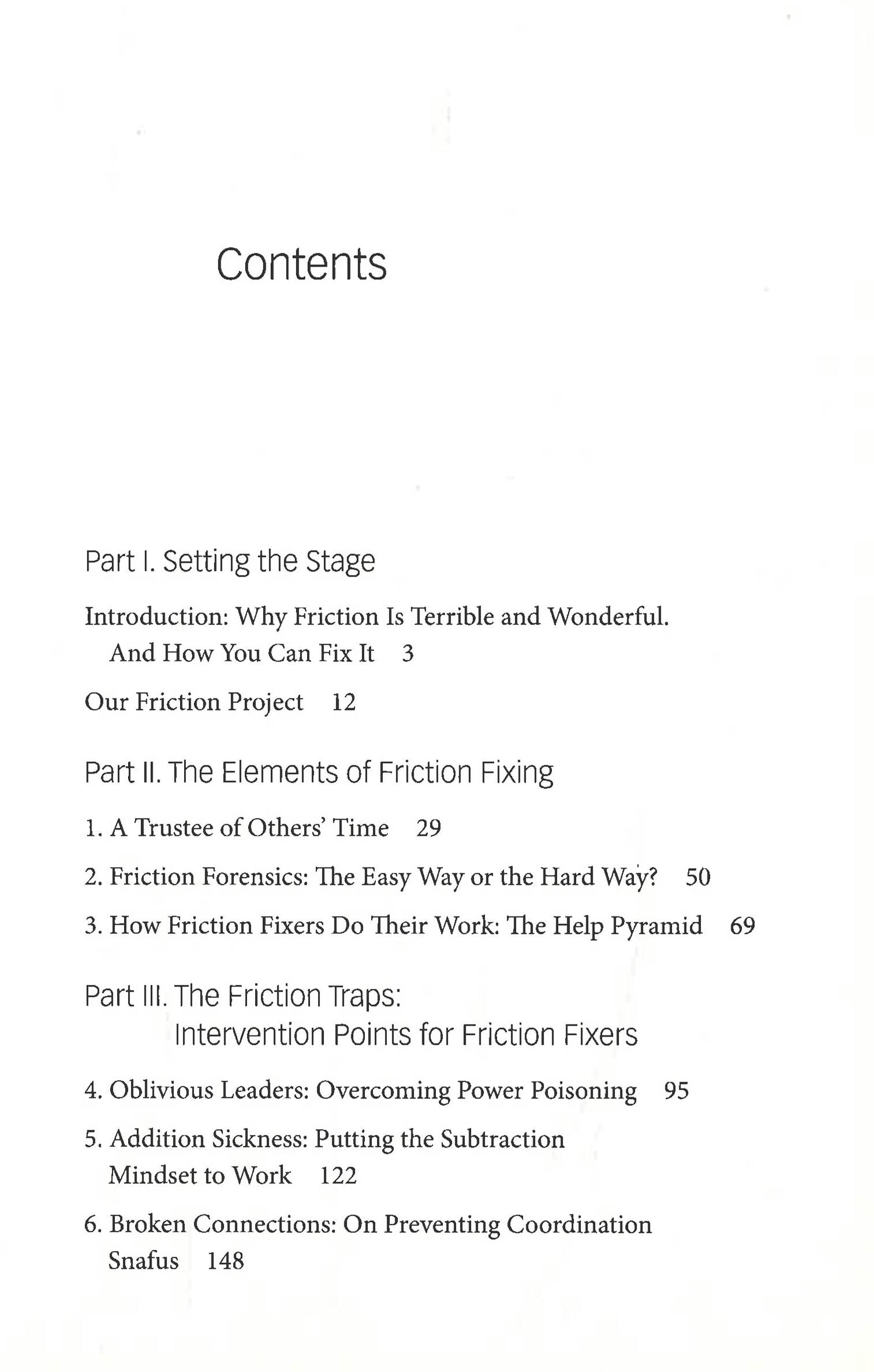 Sutton and Rao kick off the book by unpacking how skilled friction fixers think and act like trustees of others’ time. They provide friction forensics to help readers identify where to avert and repair bad organizational friction and where to maintain and inject good friction. Then their help pyramid shows how friction fixers do their work, from reframing friction troubles they can’t fix right now, so they feel less threatening, to designing and repairing organizations. The heart of the book digs into the causes and solutions for five of the most common and damaging friction troubles: oblivious leaders, addition sickness, broken connections, jargon monoxide, and fast and frenzied people and teams.