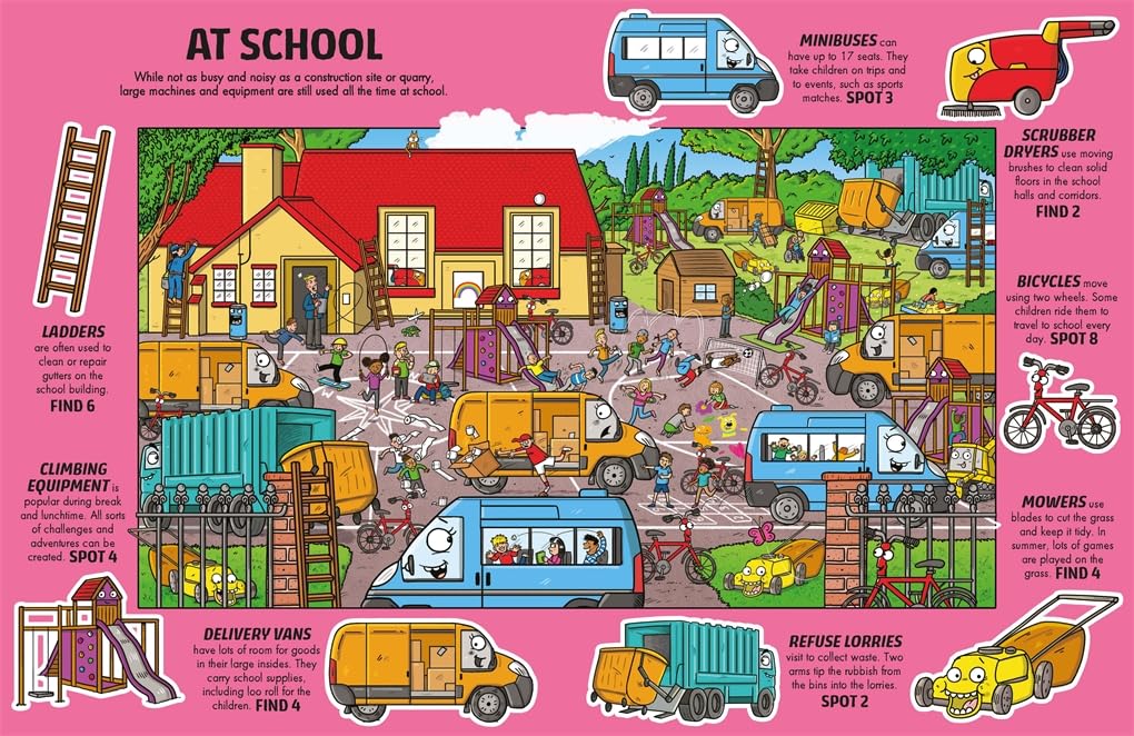 This search and find book is packed full of fun facts and friendly, colorful scenes showing diggers, trucks, loaders, trimmers and tons of other awesome pieces of machinery.