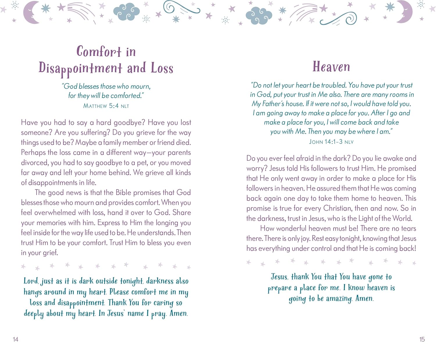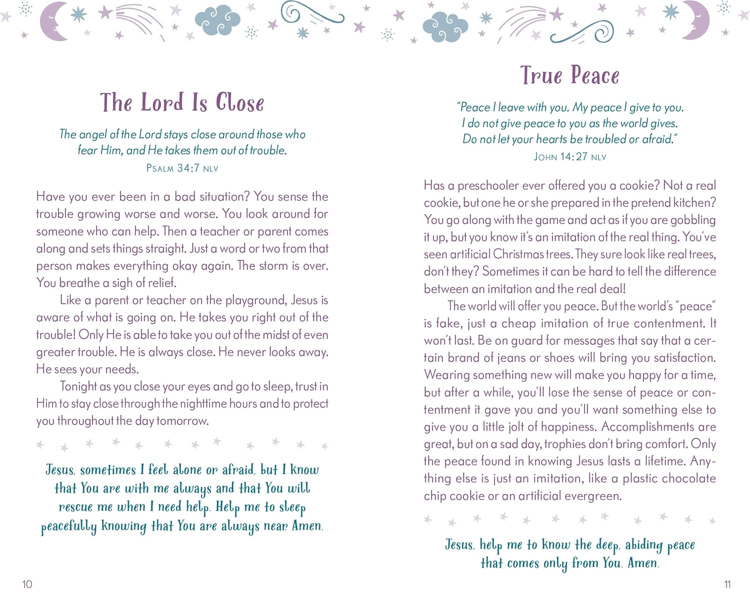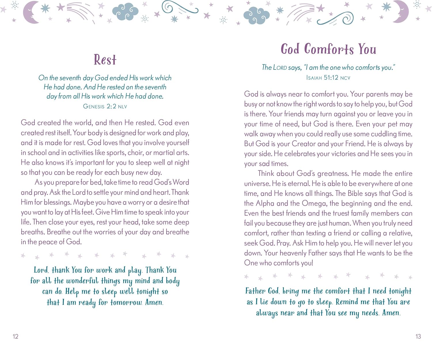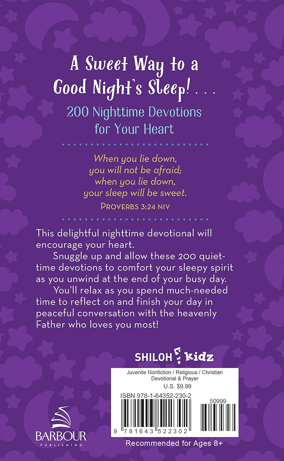 Inspired by Proverbs 3:24 (NIV): "When you lie down, you will not be afraid; when you lie down, your sleep will be sweet," this delightful nighttime devotional will encourage your heart. Two hundred devotions will comfort and refresh your sleepy spirit as you unwind at the end of your busy day. You'll relax as you spend much-needed quiet time. . .to reflect on and end your day in peaceful conversation with the heavenly Father.
