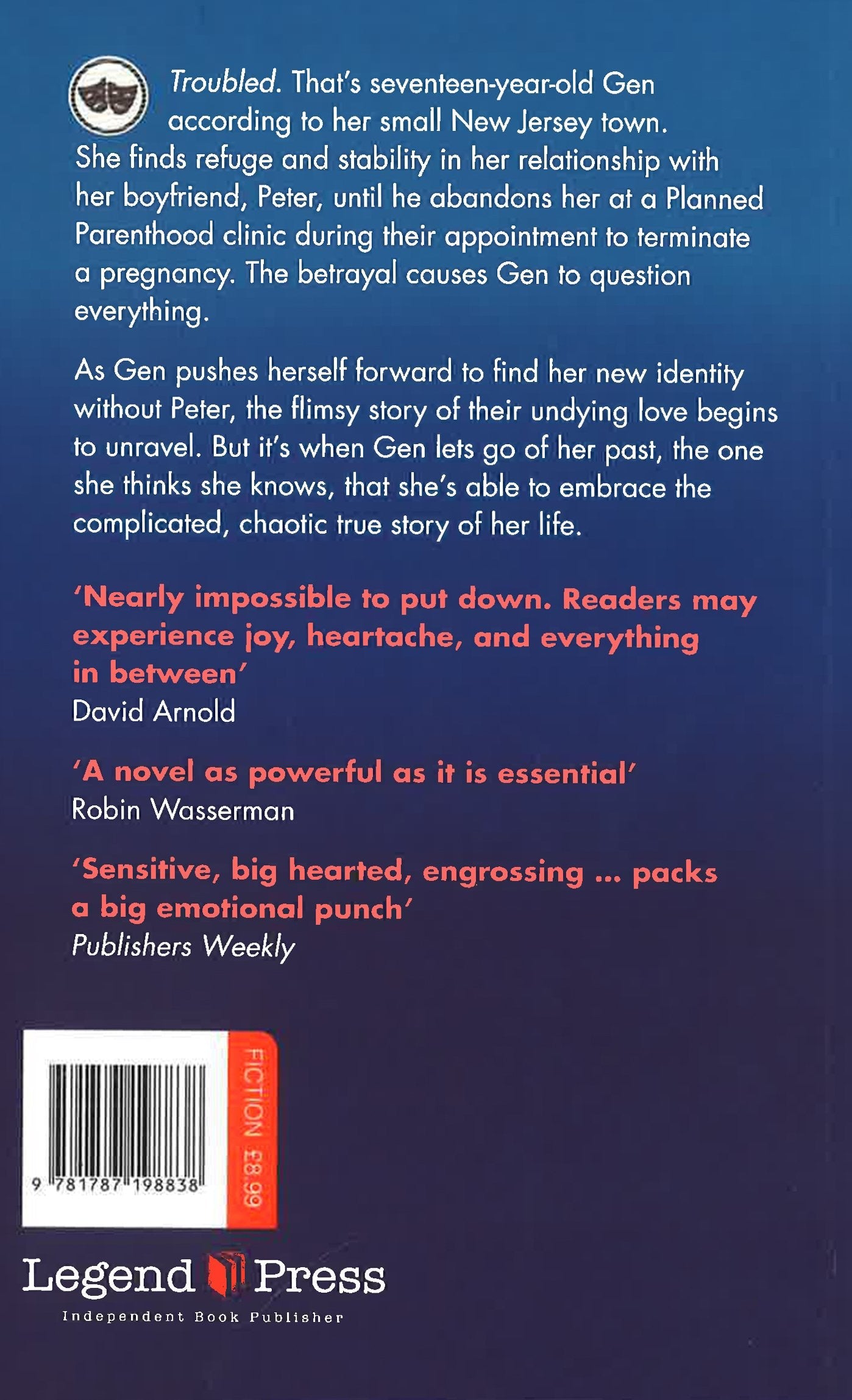 Moving, authentic, timely, ' Kathleen Glasgow 'A laudable debut. Young Adults? You're in for a treat' Nudge Books Troubled. That's seventeen-year-old Gen according to her small New Jersey town. She finds refuge and stability in her relationship with her boyfriend, Peter, until he abandons her at a Planned Parenthood clinic during their appointment to terminate a pregnancy. The betrayal causes Gen to question everything. As Gen pushes herself forward to find her new identity without Peter, the flimsy story of their undying love begins to unravel. But it's when Gen lets go of her past, the one she thinks she knows, that she's able to embrace the complicated, chaotic true story of her life.