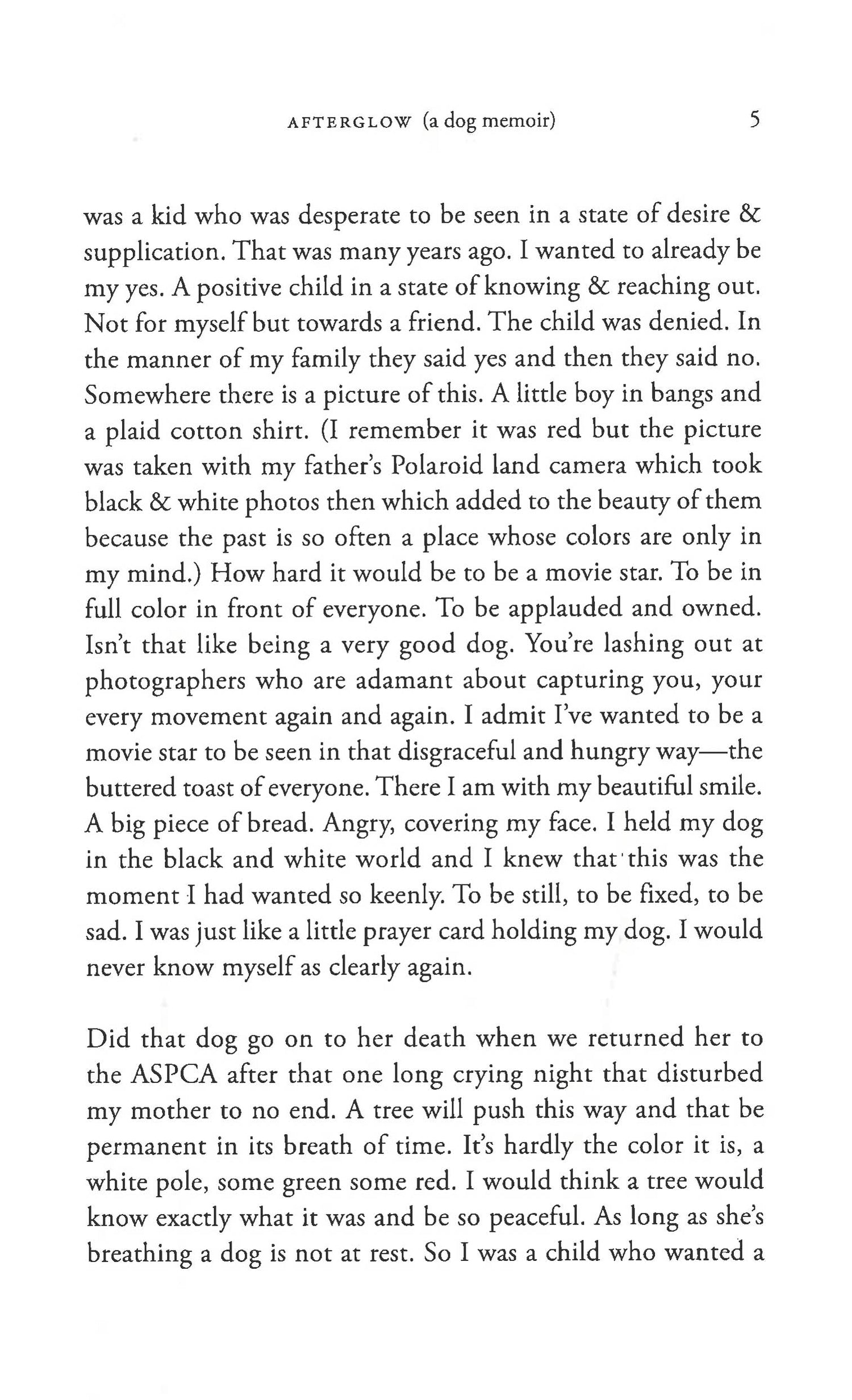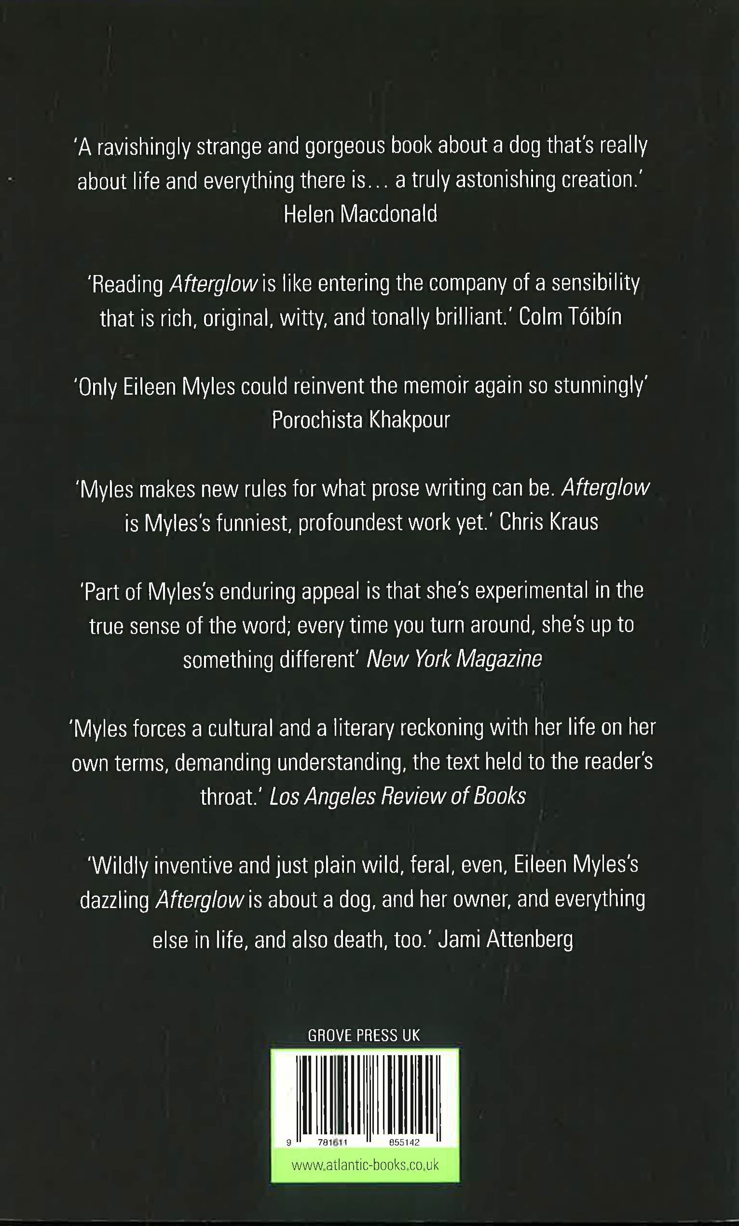 Skinny's Book of the Year, 2018In 1990, Myles chose Rosie from a litter on the street, and their connection instantly made an indelible impact on the writer's way of being. Over the course of sixteen years together, Myles was devoted to the pit bull and their linked quality of life. And starting from the emptiness following Rosie's death, Afterglow launches a playful and incisive investigation into the mostly mutually beneficial, sometimes reprehensible power dynamics between pet and pet-owner. At the same time, it reimagines Myles's experiences with alcoholism and recovery, intimacy and mourning, celebrity and politics, spirituality and family history, while joyously transcending the parameters of memoir.Moving from an imaginary talk show where Rosie is interviewed by Myles's childhood puppet, to a critical reenactment of the night Rosie mated with another pit bull; from shimmering poetic transcriptions of video footage taken during their walks, to Rosie's final enlightened narration from the afterlife, this totally singular text combines elements of science fiction, screenplay, monologue, and lucid memory to get to the heart of how and why we dedicate our existence to our dogs.