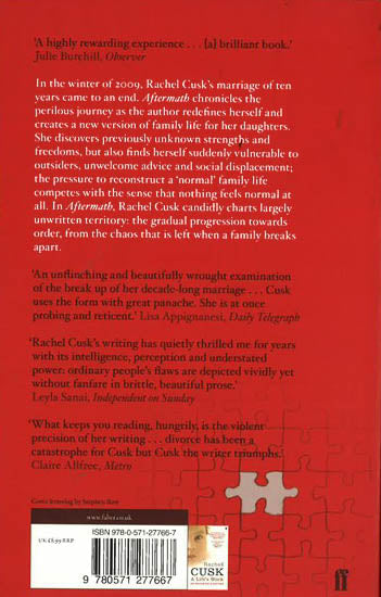 In the winter of 2009, Rachel Cusk's marriage of ten years came to an end. In the months that followed, life as she had known it came apart, "like a jigsaw dismantled into a heap of broken-edged pieces". Aftermath chronicles this perilous journey as the author redefines herself as a single woman and creates a new version of family life for her daughters. She discovers previously unknown strengths and freedoms but also finds herself suddenly vulnerable to outsiders, unwelcome advice, social displacement and the absence of a clear authority. The pressure to reconstruct a 'normal' life for her daughters competes with the sense that nothing feels normal at all. Aftermathis a masterly work in which the author, at her most candid and rigorous, charts the largely unwritten journey back to order from the chaos that is left when a family breaks apart.