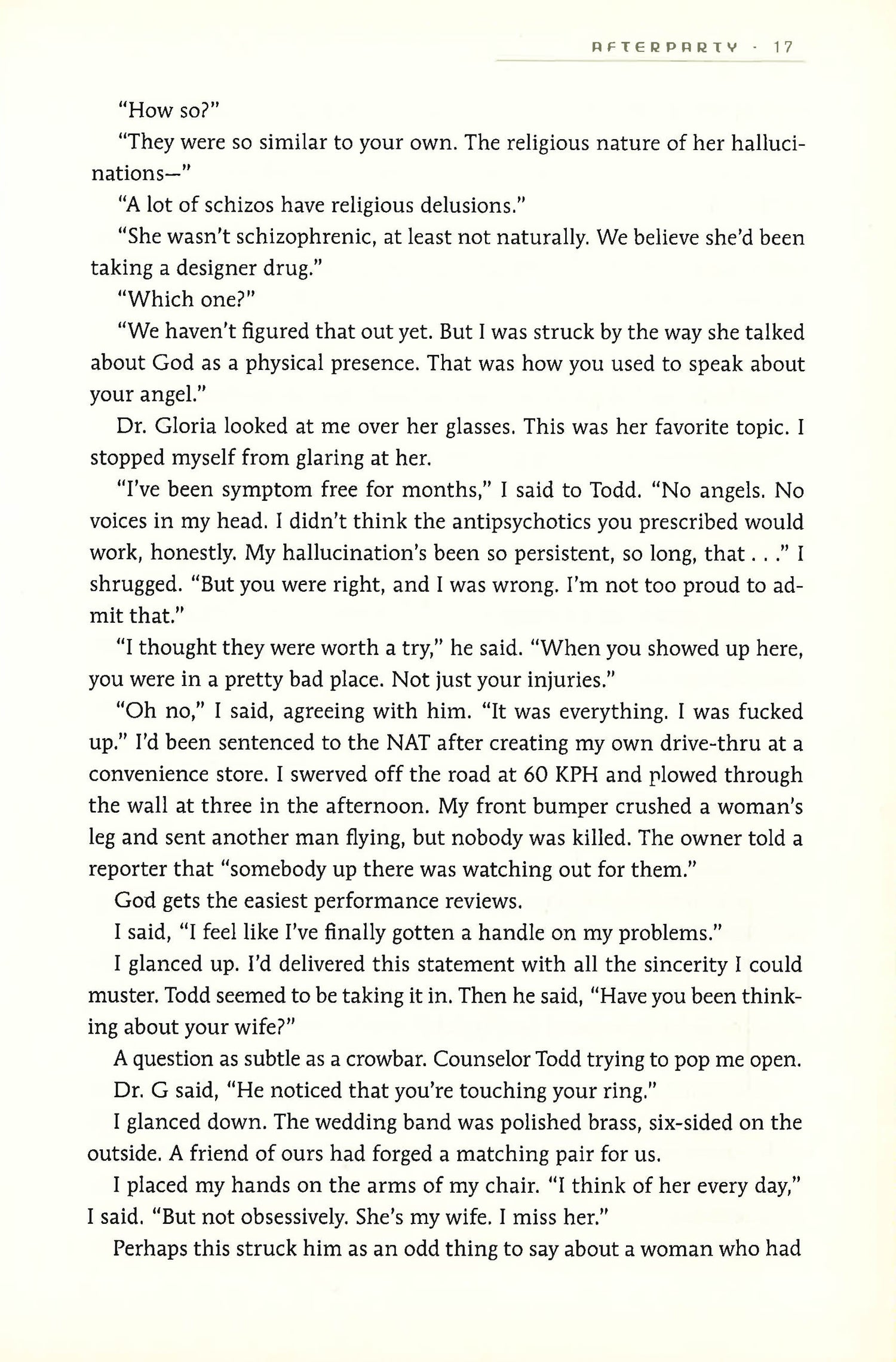It begins in Toronto, in the years after the smart drug revolution. Any high school student with a chemjet and internet connection can download recipes and print drugs, or invent them. A seventeen-year-old street girl finds God through a new brain-altering drug called Numinous, used as a sacrament by a new Church that preys on the underclass. But she is arrested and put into detention, and without the drug, commits suicide. Lyda Rose, another patient in that detention facility, has a dark secret: she was one of the original scientists who developed the drug. With the help of an ex-government agent and an imaginary, drug-induced doctor, Lyda sets out to find the other three survivors of the five who made the Numinous in a quest to set things right. A mind-bending and violent chase across Canada and the US, Daryl Gregory's Afterparty is a last chance to save civilization, or die trying.