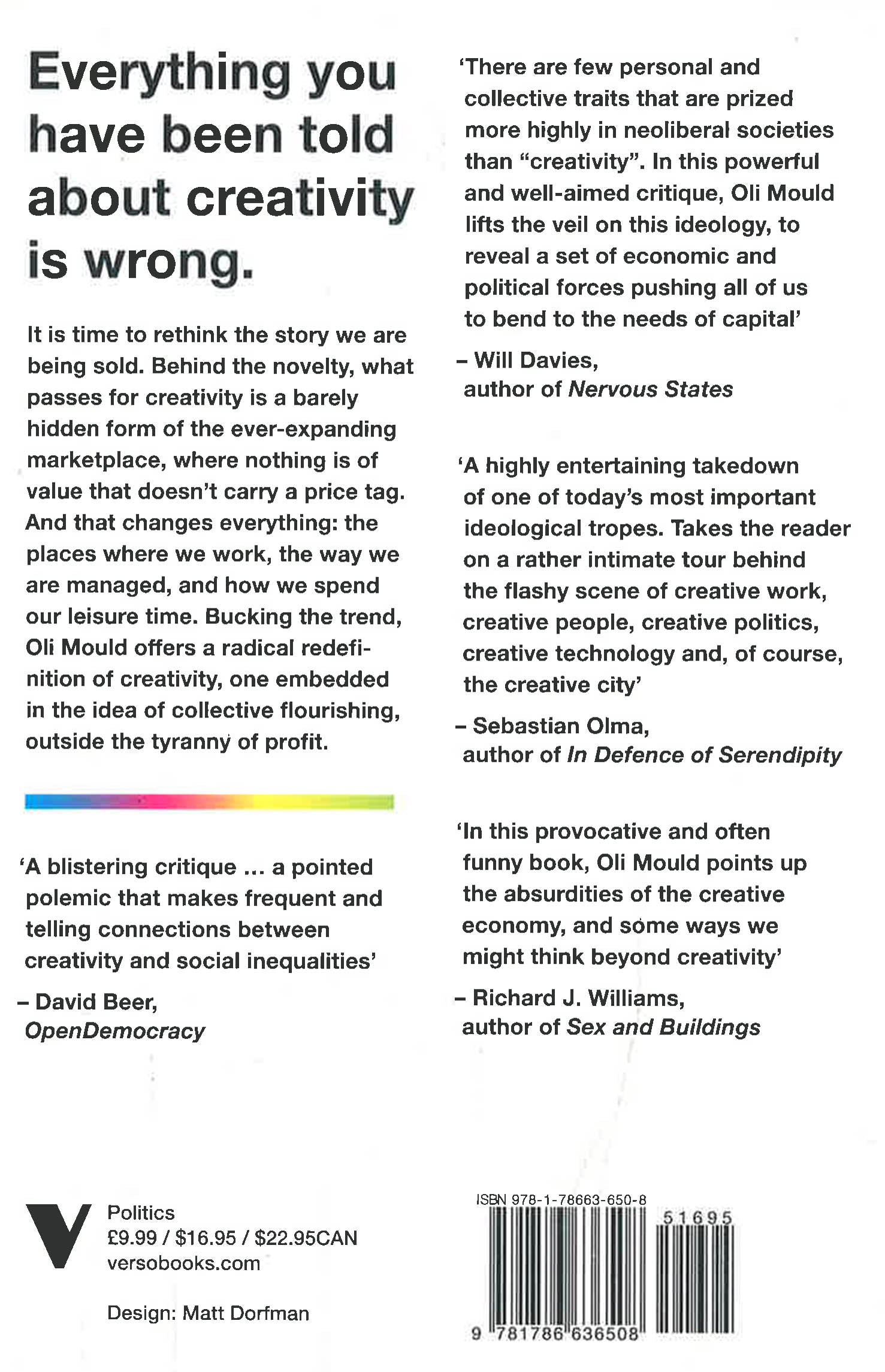 In this brilliant, counter intuitive blast Oli Mould demands that we rethink the story we are being sold. Behind the novelty, he shows that creativity is a barely hidden form of neoliberal appropriation. It is a regime that prioritizes individual success over collective flourishing. It refuses to recognise anything - job, place, person - that is not profitable. And it impacts on everything around us: the places where we work, the way we are managed, how we spend our leisure time.