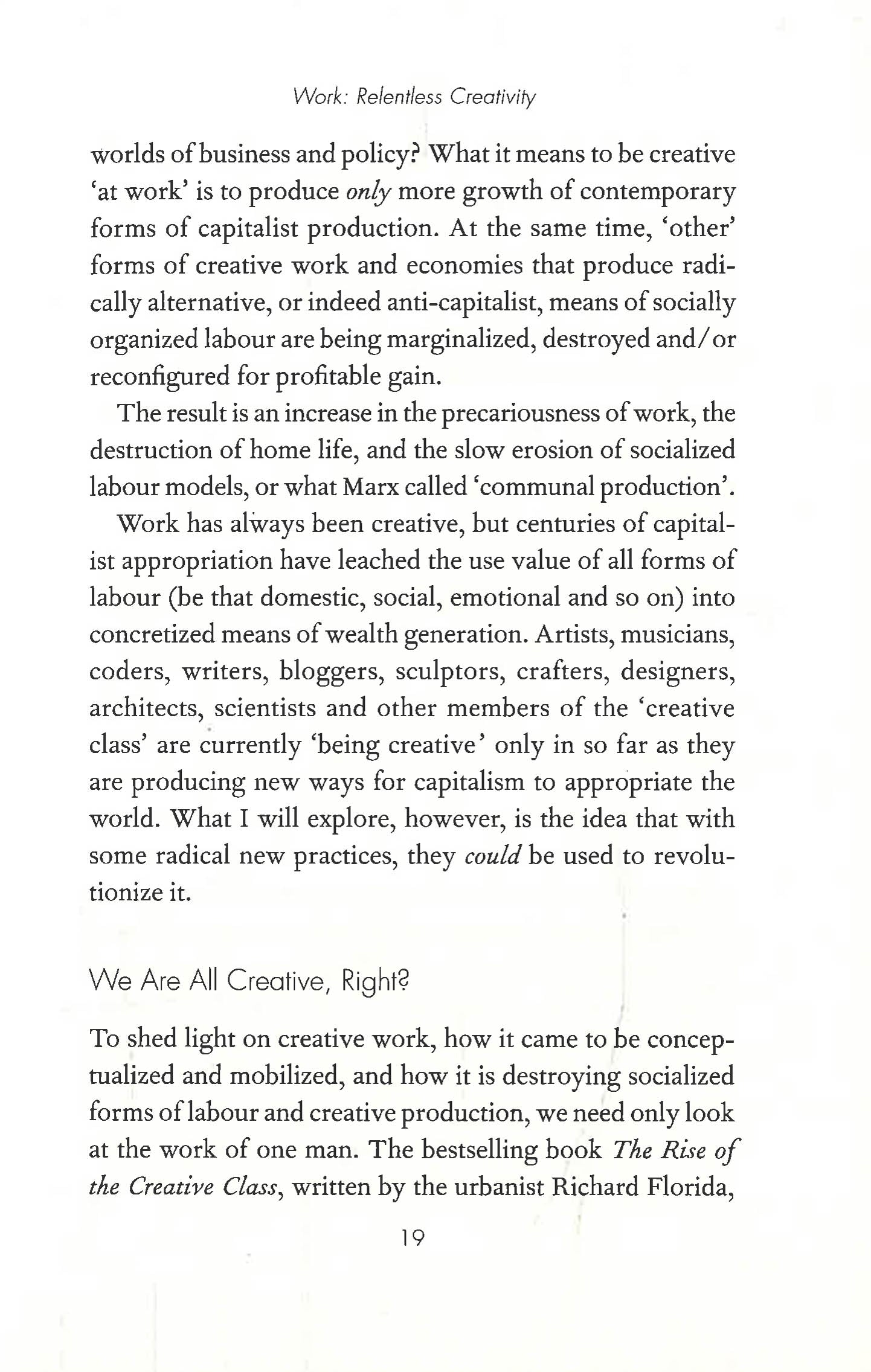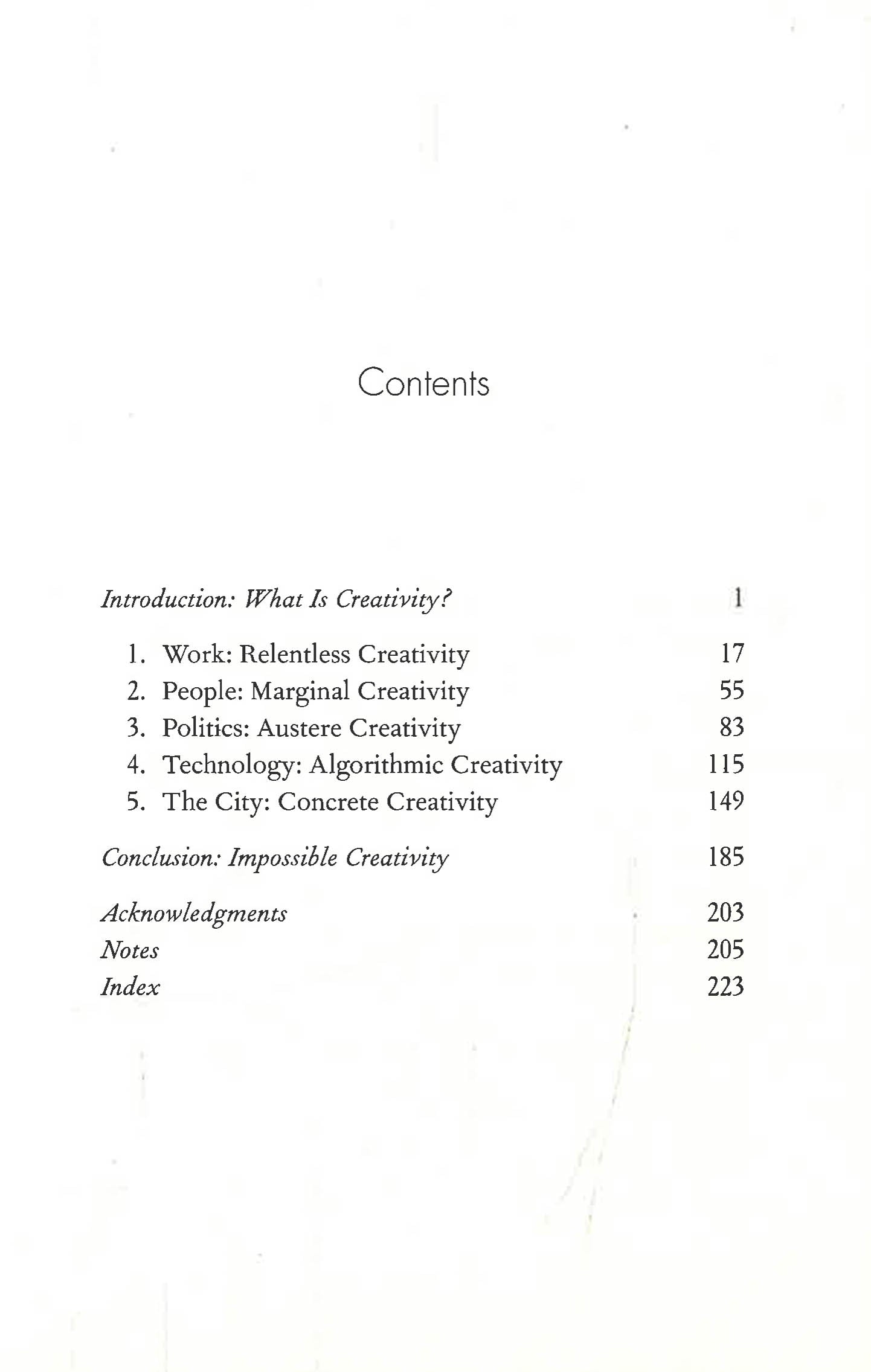 From line managers, corporate CEOs, urban designers, teachers, politicians, mayors, advertisers and even our friends and family, the message is 'be creative'. Creativity is heralded as the driving force of our contemporary society; celebrated as agile, progressive and liberating. It is the spring of the knowledge economy and shapes the cities we inhabit. It even defines our politics. What could possibly be wrong with this?