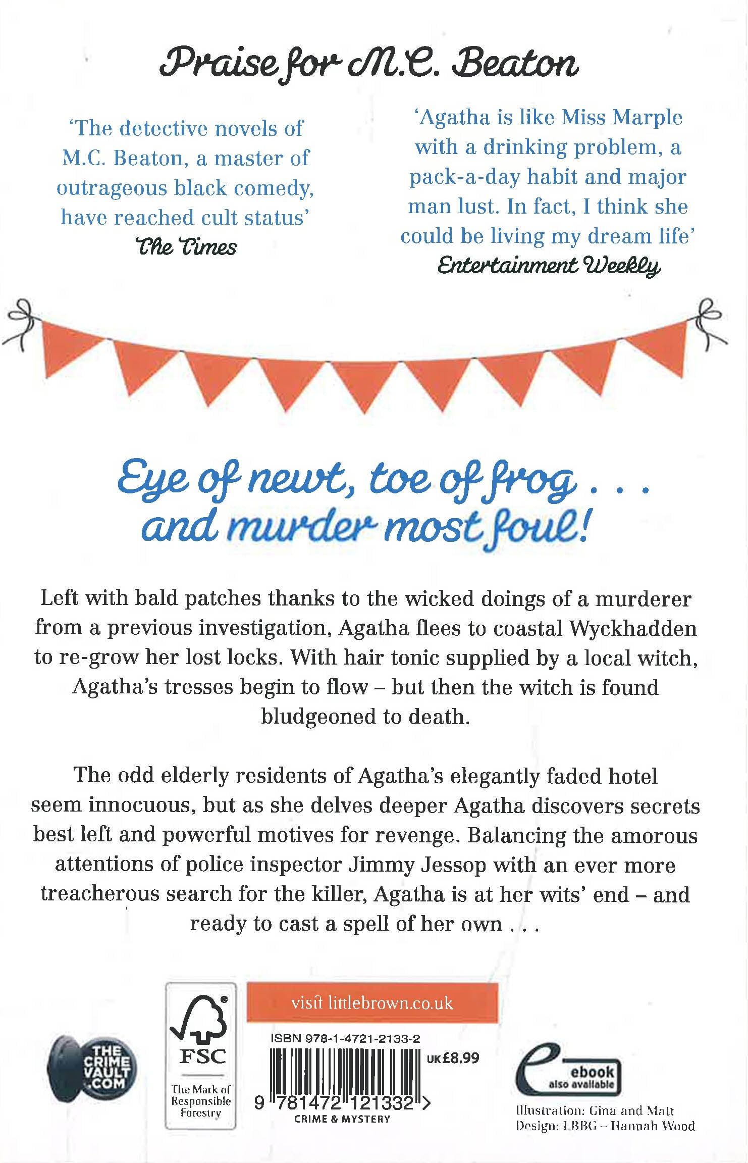 Eye of newt, toe of frog ...and murder most foul! Left with bald patches thanks to the wicked doings of a murderer from a previous investigation, Agatha flees to coastal Wyckhadden to re-grow her lost locks. With hair tonic supplied by a local witch, Agatha's tresses begin to flow - but the witch is found bludgeoned to death. The odd elderly residents of Agatha's elegantly faded hotel seem innocuous, but as she delves deeper she discovers secrets best left and powerful motives for revenge. Balancing the amorous attentions of police inspector Jimmy Jessop with an ever more treacherous search for the killer, Agatha is at her wits' end - and ready to cast a spell of her own ...