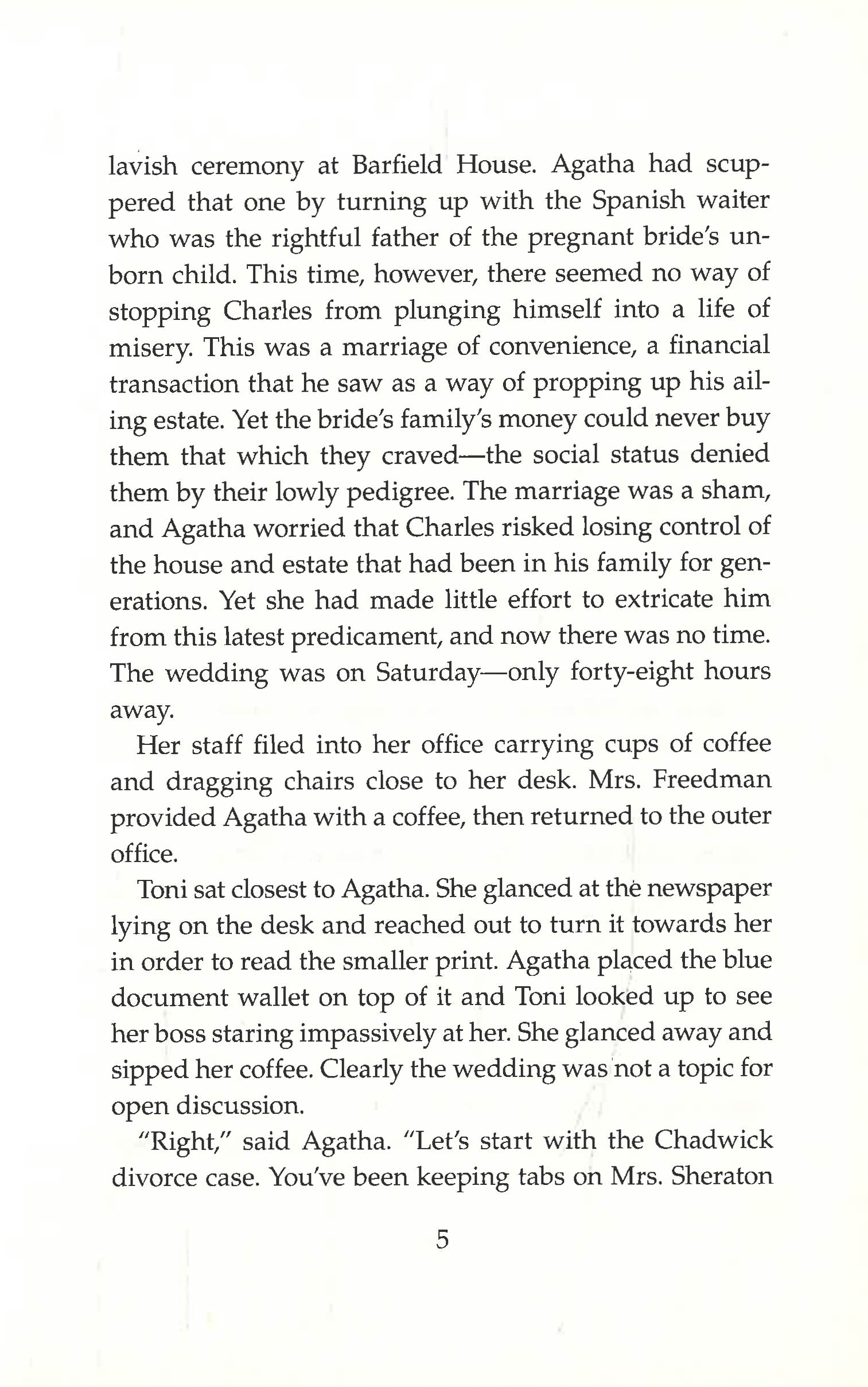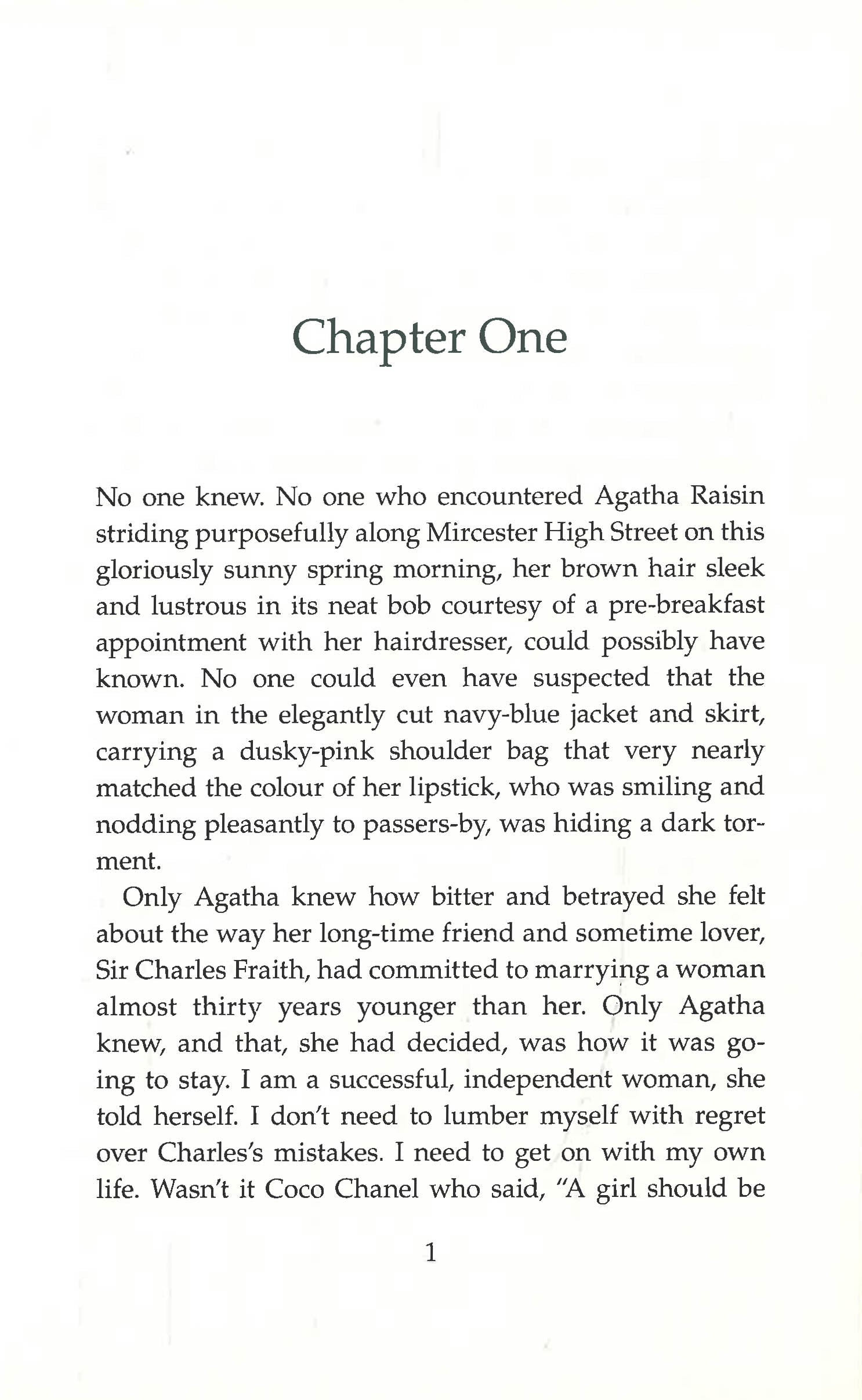 When Private Investigator Agatha Raisin learns that her friend and one-time lover Charles Fraith is to be married to a mysterious socialite, Miss Mary Brown-Field, she sees it as her duty to find out what she can about the woman. Coming up empty, Agatha--out of selfless concern for Charles, of course--does the only sensible thing she can think of: she crashes their wedding, which ends in a public altercation. Nursing a hangover the next morning, she gets a phone call from Charles, with even more disturbing news: Mary has been murdered.
