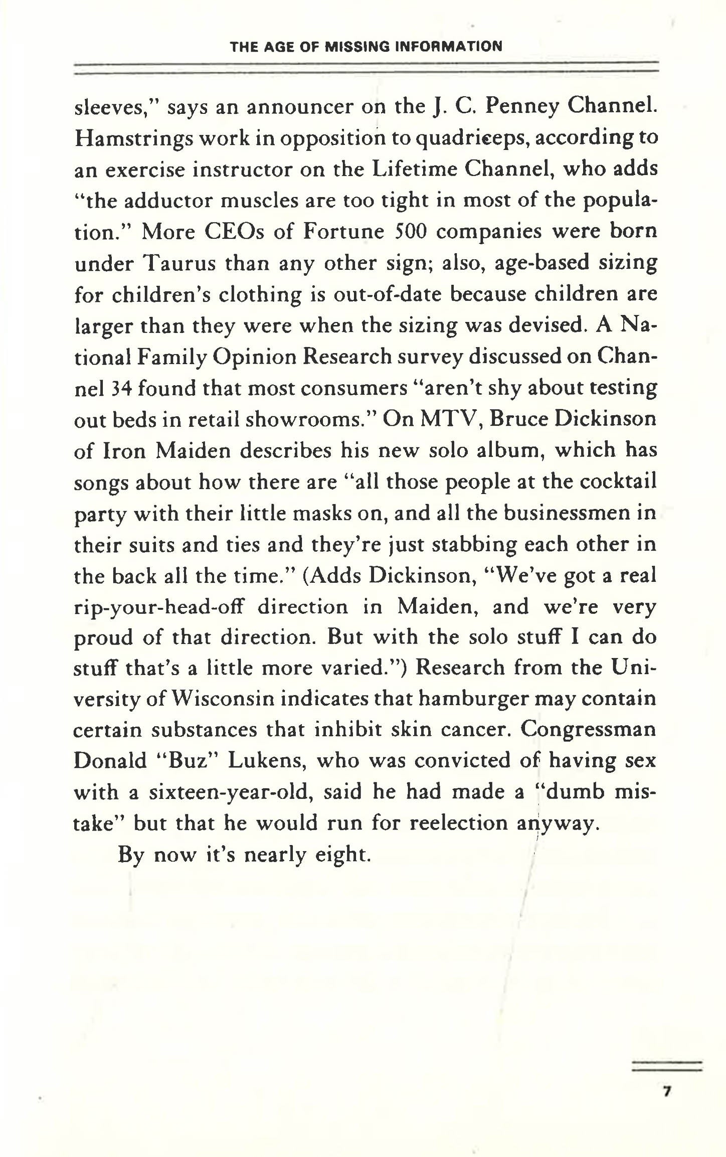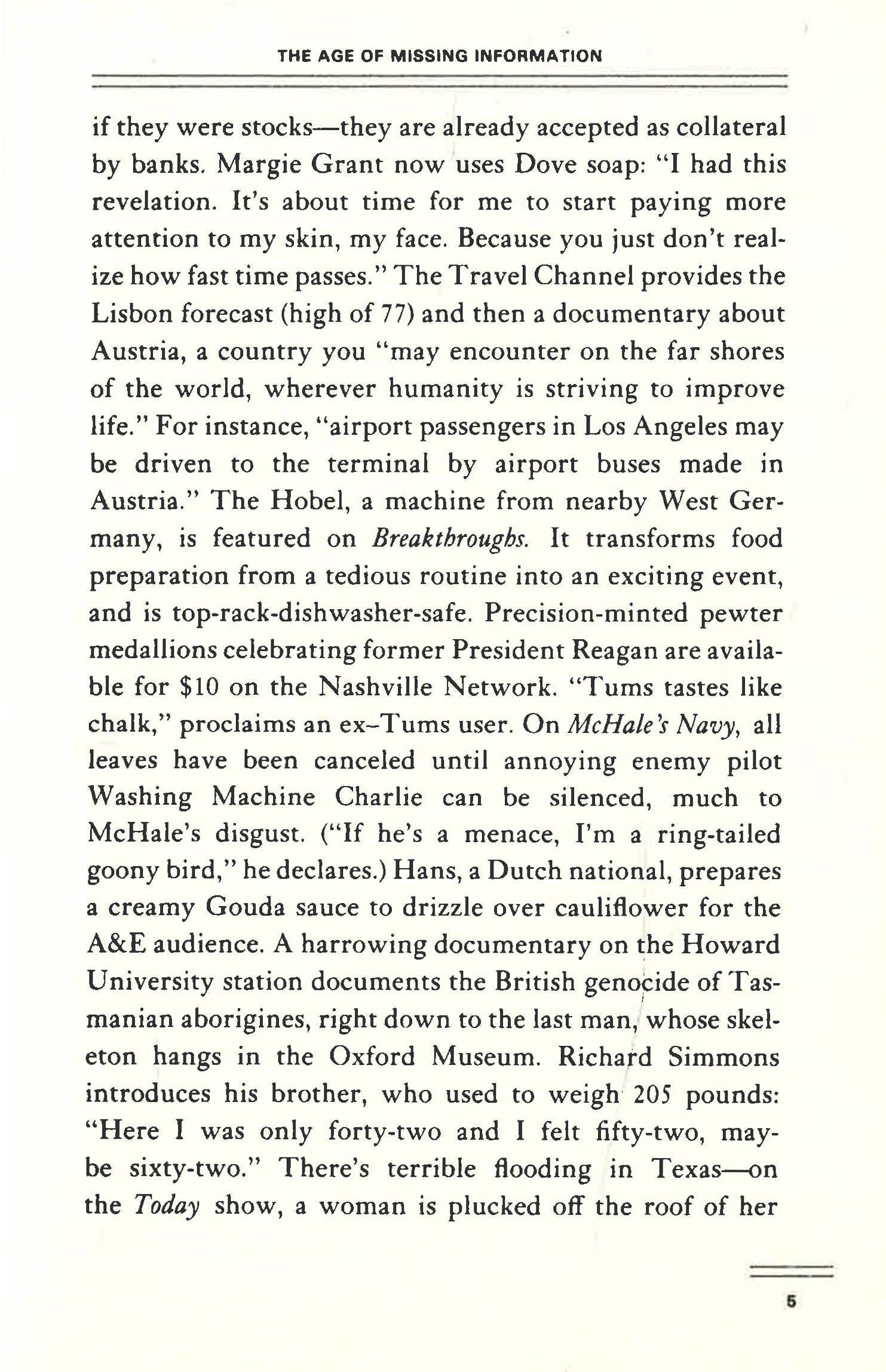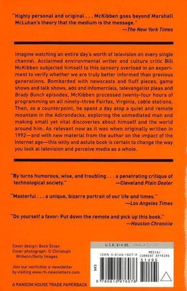 Highly personal and original . . . McKibben goes beyond Marshall McLuhan's theory that the medium is the message. ----The New York Times Imagine watching an entire day's worth of television on every single channel. Acclaimed environmental writer and culture critic Bill McKibben subjected himself to this sensory overload in an experiment to verify whether we are truly better informed than previous generations. Bombarded with newscasts and fluff pieces, game shows and talk shows, ads and infomercials, televangelist pleas and Brady Bunch episodes, McKibben processed twenty-four hours of programming on all ninety-three Fairfax, Virginia, cable stations. Then, as a counterpoint, he spent a day atop a quiet and remote mountain in the Adirondacks, exploring the unmediated man and making small yet vital discoveries about himself and the world around him. As relevant now as it was when originally written in 1992-and with new material from the author on the impact of the Internet age-this witty and astute book is certain to change the way you look at television and perceive media as a whole. "By turns humorous, wise, and troubling . . . a penetrating critique of technological society."-Cleveland Plain Dealer "Masterful . . . a unique, bizarre portrait of our life and times. -Los Angeles Times "Do yourself a favor: Put down the remote and pick up this book. -Houston Chronicle