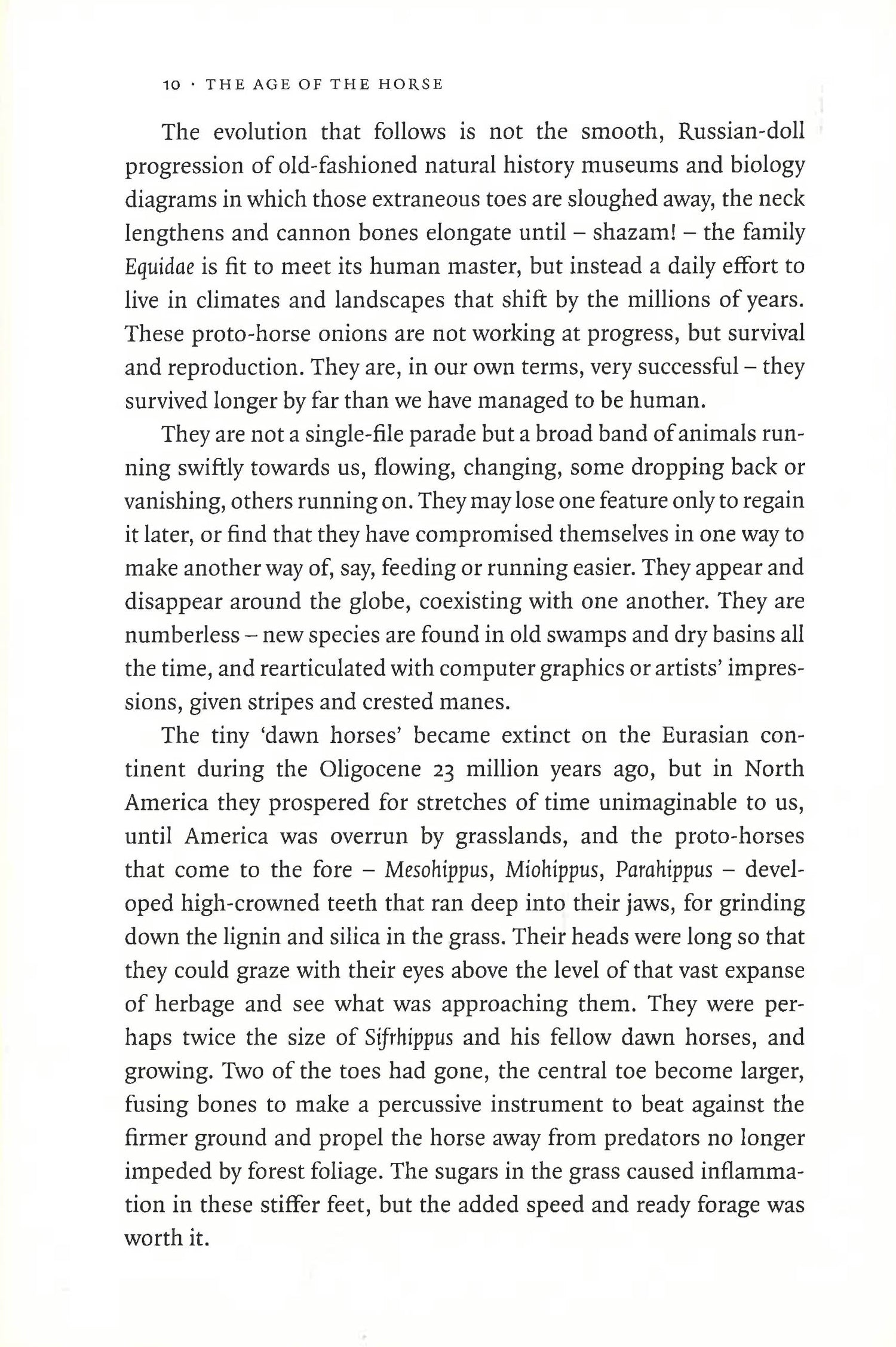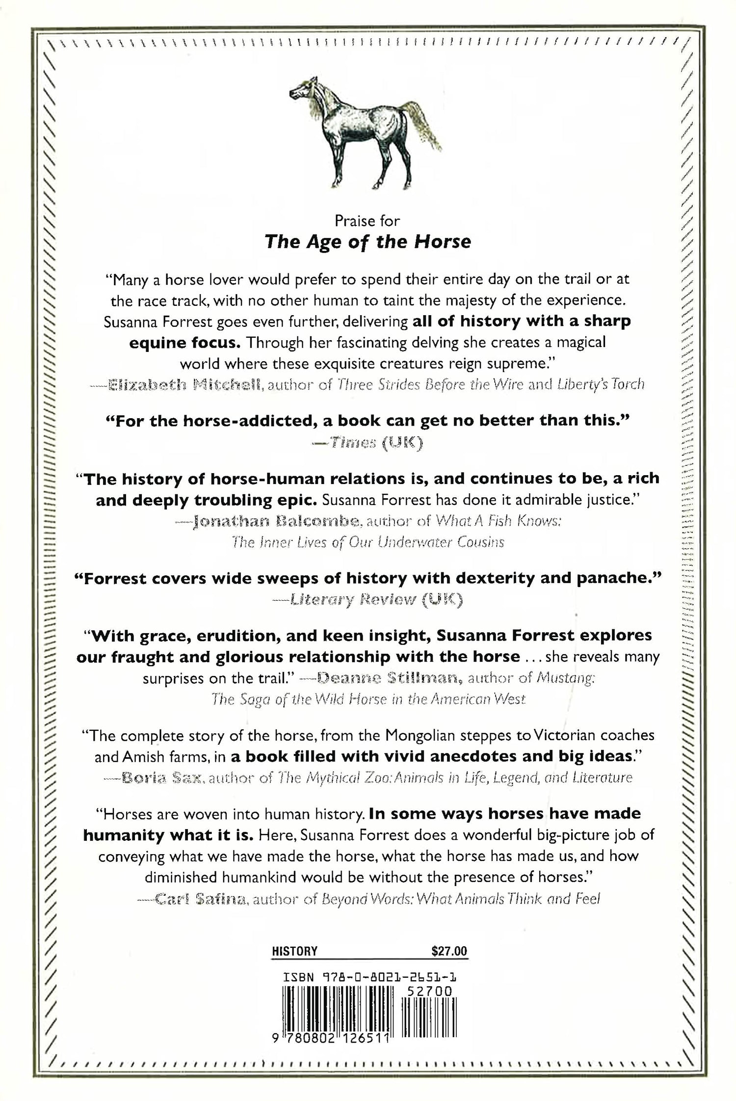 An essential book for anyone who's ever been captivated by horses, The Age of the Horse is a breathtaking exploration of the enduring connection between humans and Equus caballus. Equestrian expert Susanna Forrest presents a unique, sweeping panorama of the animal's prominent role in societies around the world and across time. Fifty-six million years ago, the earliest equid walked the earth--and beginning with the first-known horse-keepers of the Copper Age, the horse has played an integral part in human history. Combining fascinating anthropological detail and incisive personal anecdotes, Forrest draws from an immense range of archival documents as well as literature and art to illustrate how our evolution has coincided with that of horses. In paintings and poems (such as Byron's famous "Mazeppa"), in theater and classical music (including works by Liszt and Tchaikovsky), representations of the horse have changed over centuries, portraying the crucial impact that we've had on each other. Forrest deftly synthesizes this material with her own experience in the field, traveling the globe to give us a diverse, comprehensive look at the horse in our lives today: from Mongolia where she observes the endangered takhi, to a show-horse performance at the Palace of Versailles; from a polo club in Beijing to Arlington, Virginia, where veterans with PTSD are rehabilitated through interaction with horses. With passion and singular insight, Forrest investigates the complexities of human and horse coexistence, illuminating the multifaceted ways our cultures were shaped by this powerful creature.