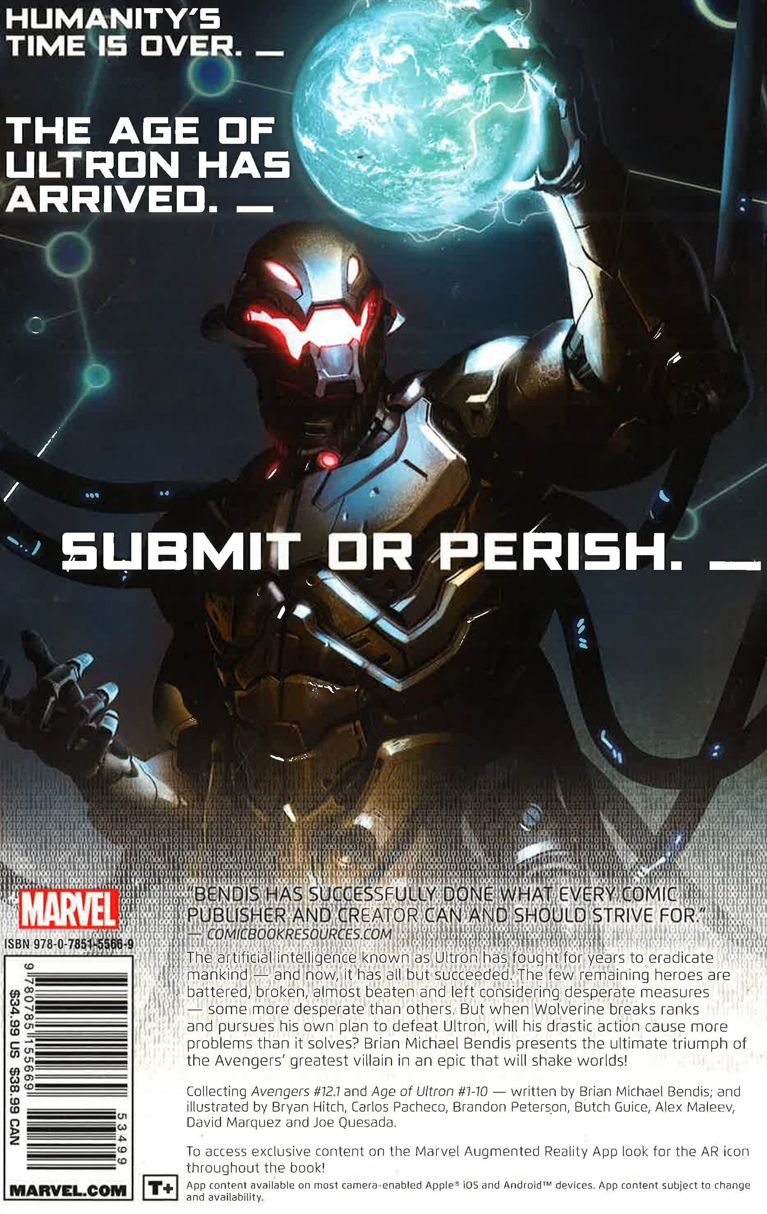 Humanity's time is over. Submit or perish, because the Age of Ultron has arrived! The artificial intelligence known as Ultron has fought for years to eradicate mankind...and now, it has all but succeeded. The few remaining heroes are battered, broken, almost beaten and left considering desperate measures - some more desperate than others. But when Wolverine breaks ranks and pursues his own plan to defeat Ultron, will his drastic action cause more problems than it solves? Brian Michael Bendis presents the ultimate triumph of the Avengers' greatest villain in an epic that will shake worlds! COLLECTING: Avengers 12.1, Age of Ultron 1-10