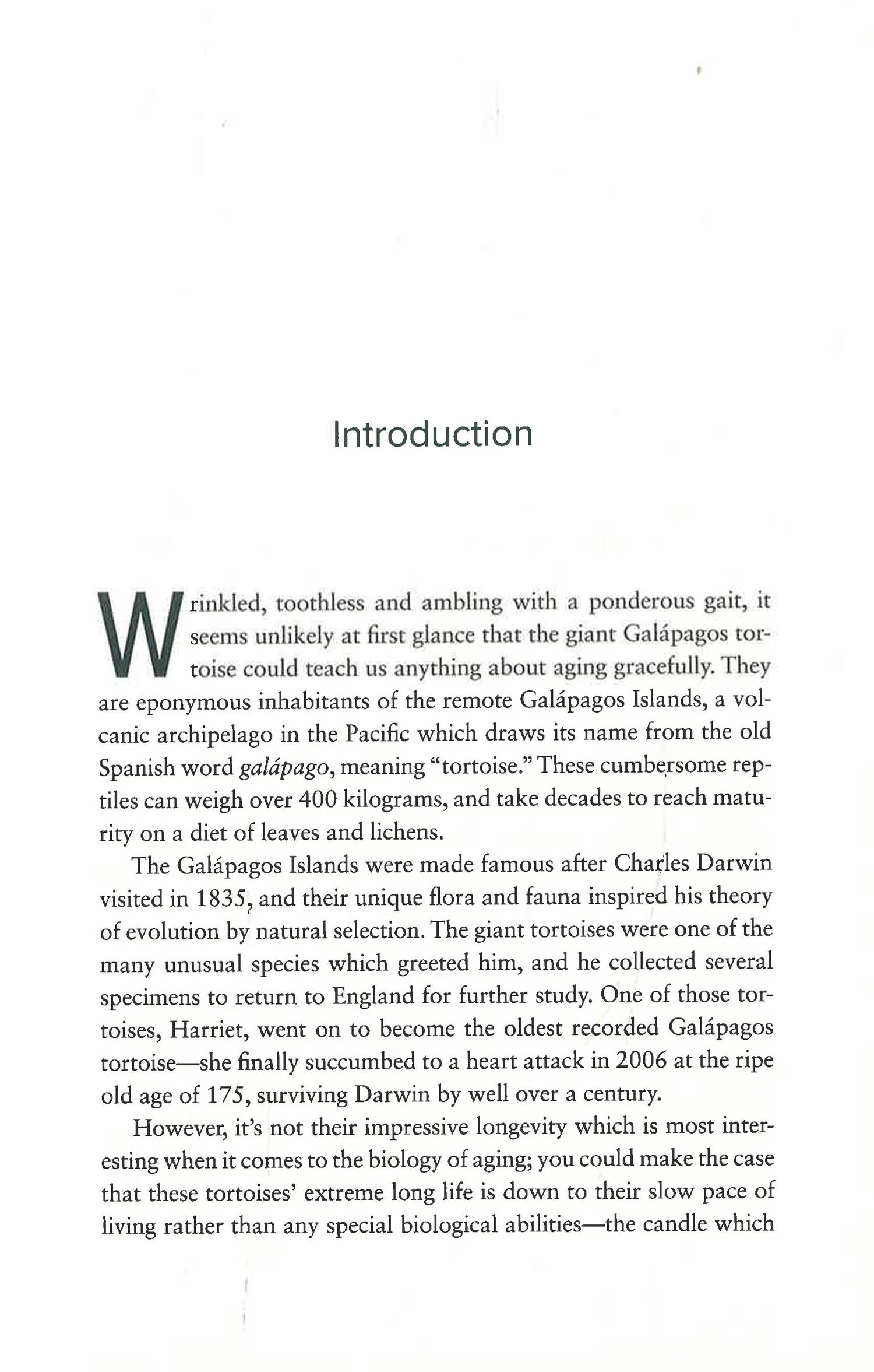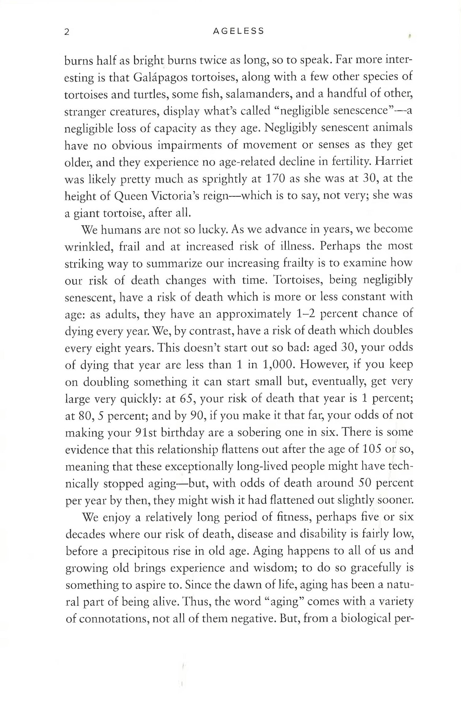 Aging--not cancer, not heart disease--is the true underlying cause of most human death and suffering. We accept as inevitable that as we advance in years our bodies and minds begin to deteriorate and that we are ever more likely to be felled by dementia or disease. But we never really ask--is aging necessary? Biologists, on the other hand, have been investigating that question for years. After all, there are tortoises and salamanders whose risk of dying is the same no matter how old they are. With the help of science, could humans find a way to become old without getting frail, a phenomenon known as "biological immortality"?