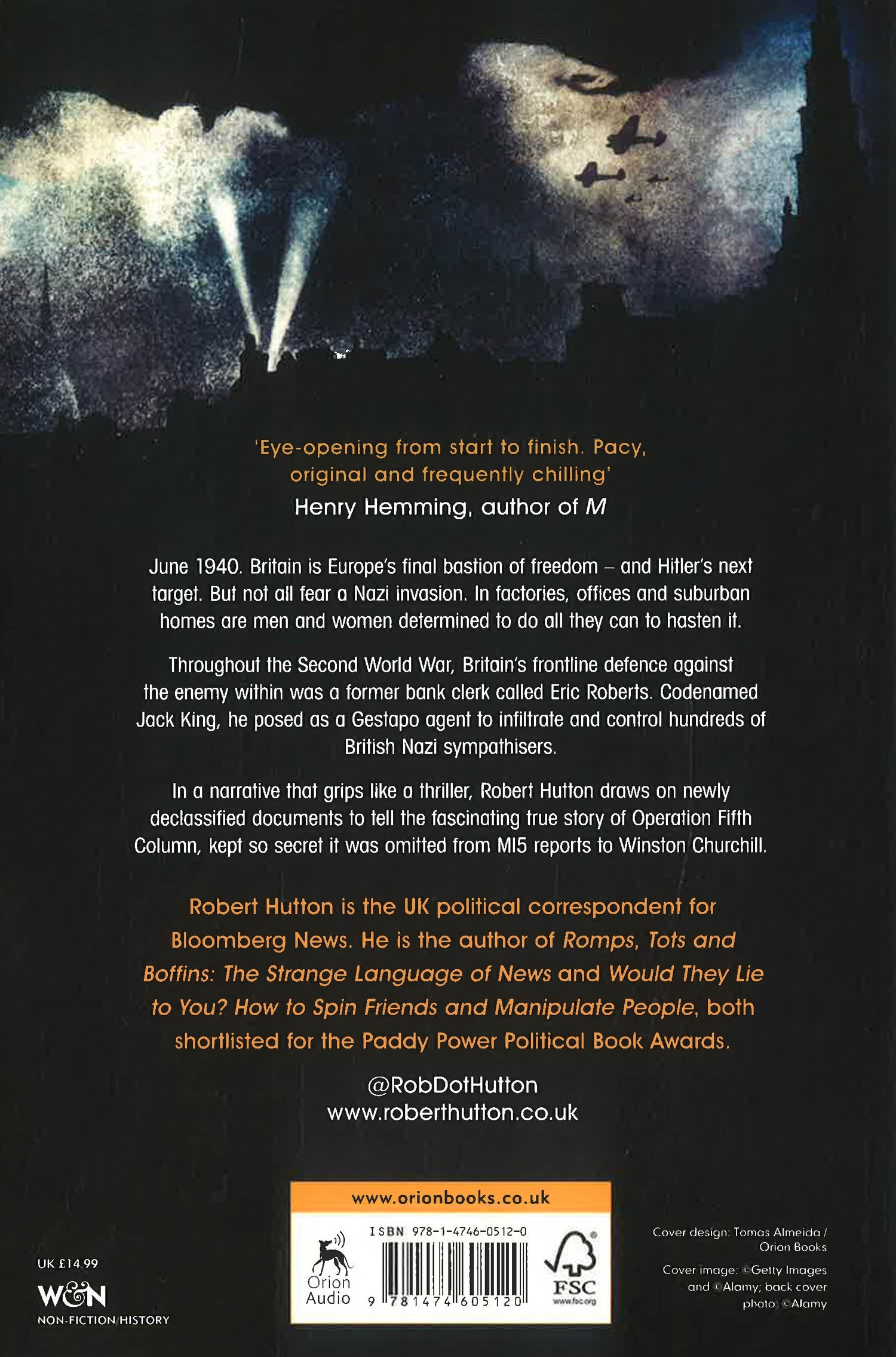 June 1940. Britain is Europe's final bastion of freedom - and Hitler's next target. But not everyone fears a Nazi invasion. In factories, offices and suburban homes are men and women determined to do all they can to hasten it.Throughout the Second World War, Britain's defence against the enemy within was Eric Roberts, a former bank clerk from Epsom. Equipped with an extraordinary ability to make people trust him, he was recruited into the shadowy world of espionage by the great spymaster Maxwell Knight. Roberts penetrated first the Communist Party and then the British Union of Fascists, before playing his greatest role for MI5 - as Hitler's man in London. Codenamed Jack King, he single-handedly built a network of hundreds of British Nazi sympathisers, with many passing secrets to him in the mistaken belief that he was a Gestapo officer. Operation Fifth Column, run by a brilliant woman scientist and a Jewish aristocrat with a sideline in bomb disposal, was kept so secret it was omitted from the reports MI5 sent to Winston Churchill. In a narrative that grips like a thriller, Robert Hutton tells the fascinating story of an operation whose existence has only recently come to light. Drawing on newly declassified documents and private family archives, Agent Jack shatters the comfortable notion that Britain could never have succumbed to fascism, and celebrates - at last - the courage of individuals who protected the country they loved at great personal risk.