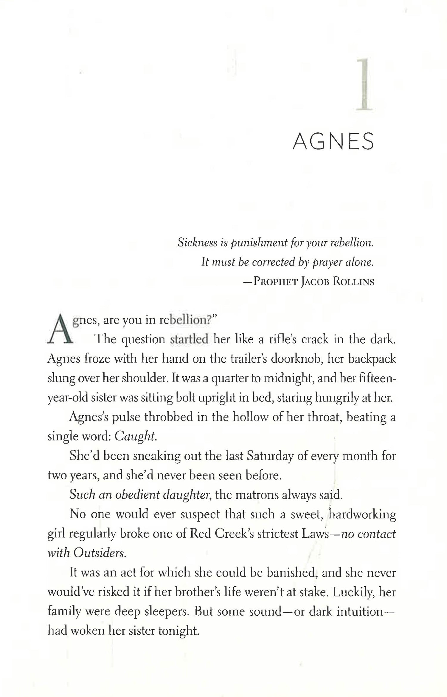 Agnes knows she loves her home of Red Creek--its quiet, sunny mornings, its dusty roads, and its God. There, she cares tirelessly for her younger siblings and follows the town's strict laws. What she doesn't know is that Red Creek is a cult, controlled by a madman who calls himself a prophet.