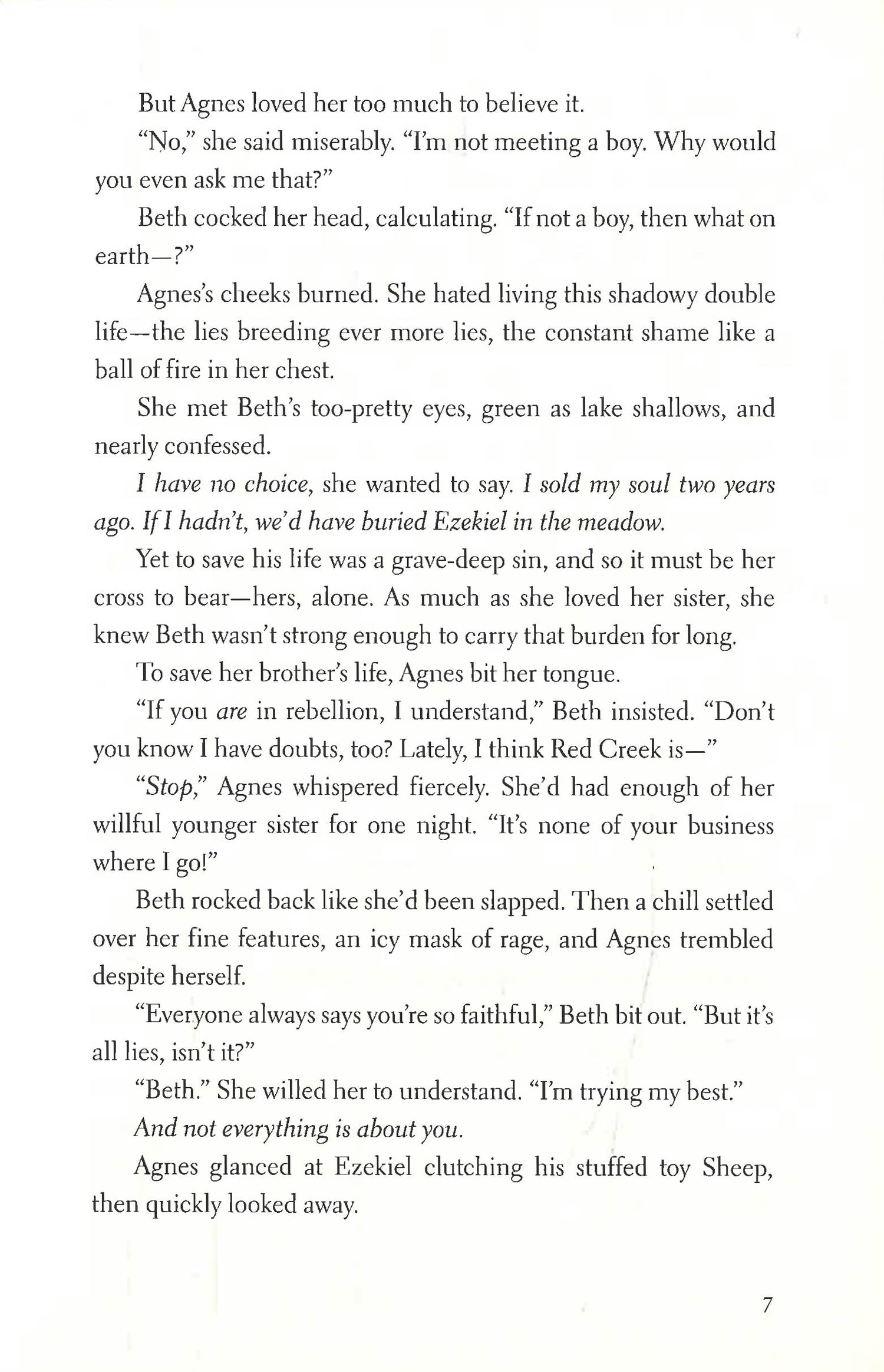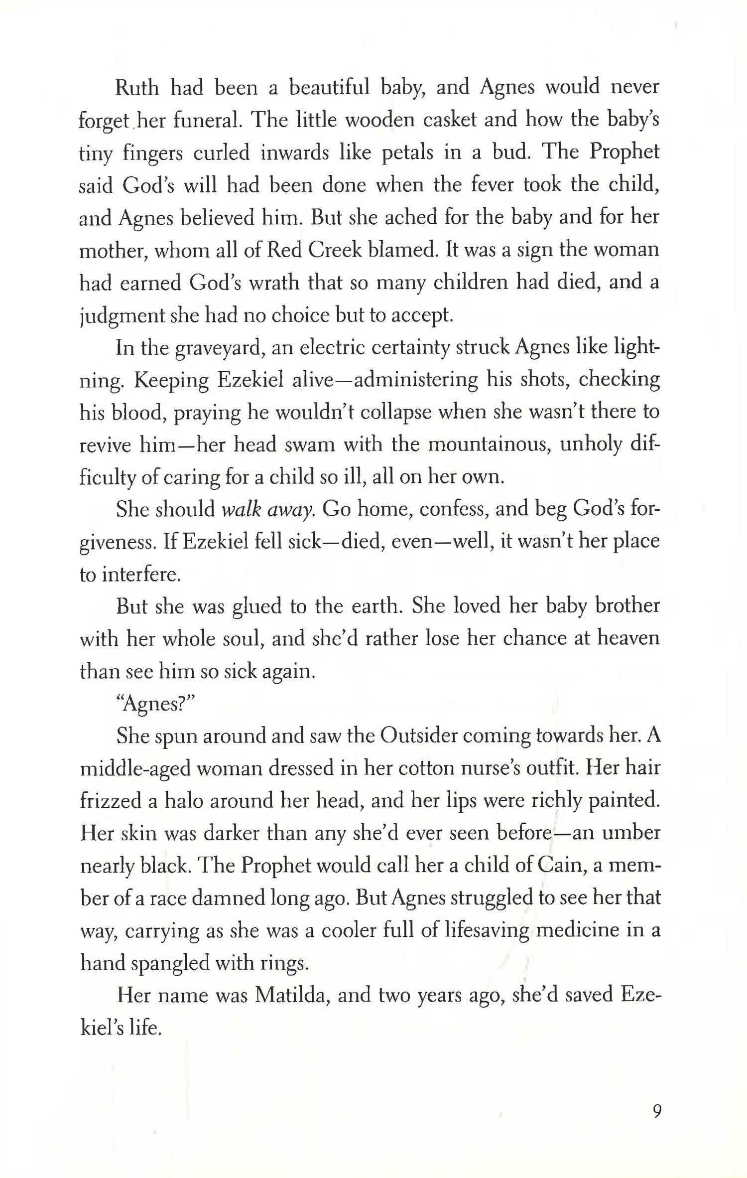 Then Agnes meets Danny, an Outsider boy, and begins to question what is and isn't a sin. Her younger brother, Ezekiel, will die without the insulin she barters for once a month, even though medicine is considered outlawed. Is she a sinner for saving him? Is her sister, Beth, a sinner for dreaming of the world beyond Red Creek?