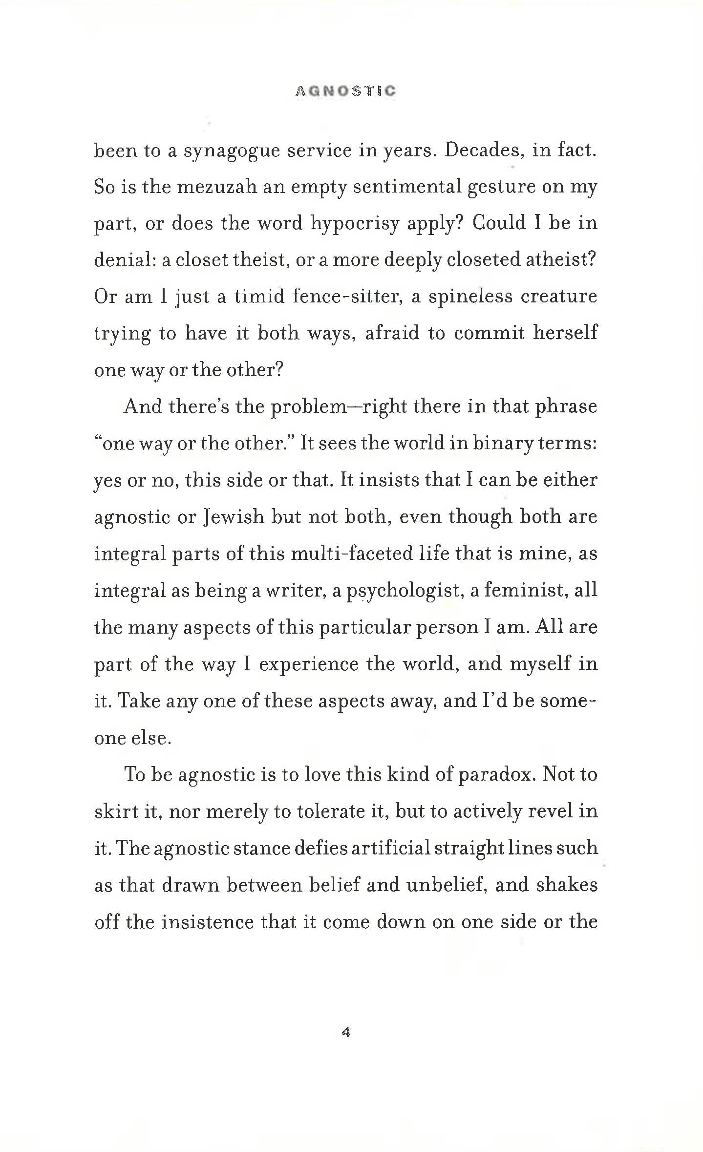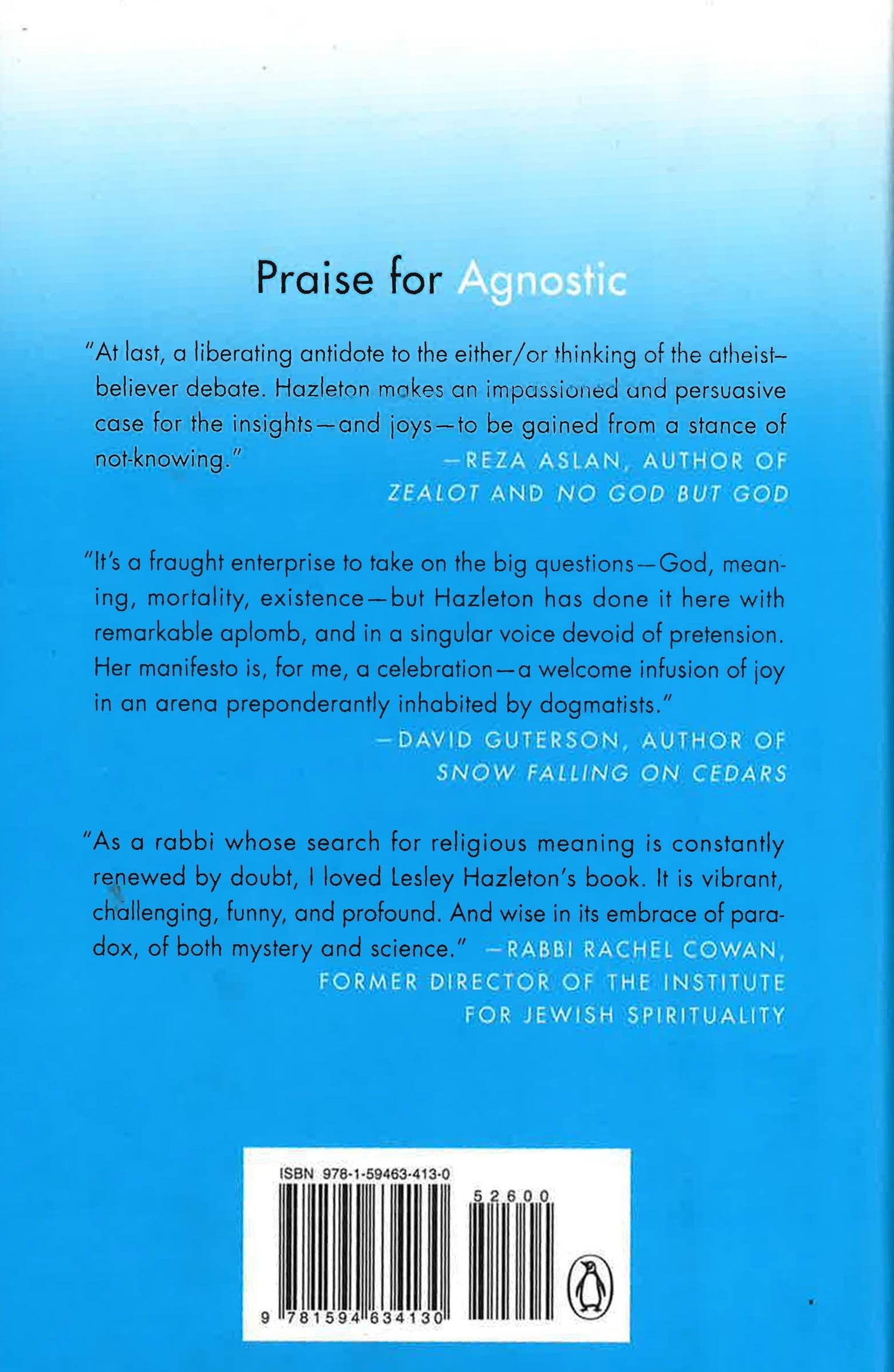 One in four Americans reject any affiliation with organized religion, and nearly half of those under thirty describe themselves as "spiritual but not religious." But as the airwaves resound with the haranguing of preachers and pundits, who speaks for the millions who find no joy in whittling the wonder of existence to a simple yes/no choice? Lesley Hazleton does. In this provocative, brilliant book, she gives voice to the case for agnosticism, breaks it free of its stereotypes as watered-down atheism or amorphous "seeking," and celebrates it as a reasoned, revealing, and sustaining stance toward life. Stepping over the lines imposed by rigid conviction, she draws on philosophy, theology, psychology, science, and more to explore, with curiosity and passion, the vital role of mystery in a deceptively information-rich world; to ask what we mean by the search for meaning; to invoke the humbling yet elating perspective of infinity; to challenge received ideas about death; and to reconsider what "the soul" might be. Inspired and inspiring, Agnostic recasts the question of belief not as a problem to be solved but as an invitation to an ongoing, open-ended adventure of the mind.