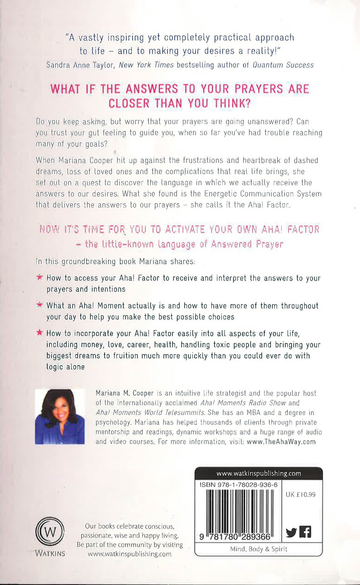 What if the answers to your prayers are closer than you think? Do you keep asking, but feel your prayers are going unanswered or taking an extremely long time to come to fruition? xWhen Mariana Cooper hit up against the frustrations and heartbreak of dashed dreams, loss of loved ones and the complications that real life brings, she set out on a quest to learn the language in which we actually receive the answers to our desires. What she discovered is the Energetic Communication System that delivers the answers to our prayers - she calls it the Aha! Factor.Now it's time for you to activate your ownAha! Factor - The little-known language of Answered PrayerIn this eye-opening book Mariana shares:* How to access your Aha! Factor to receive and interpret the answers to your prayers and intentions* What an Aha! Moment actually is and how to have more of them throughout your day to help you to make decisions that you can believe in. * The list of 101 Signs, Symbols and Synchronicities that show when a message is coming to you and what it means.* How to easily incorporate your Aha!Factor into all aspects of your life, including money, love and other relationships, body, work, handling toxic people and situations and bringing your biggest dreams and goals to fruition much more quickly than you could ever do with logic alone.