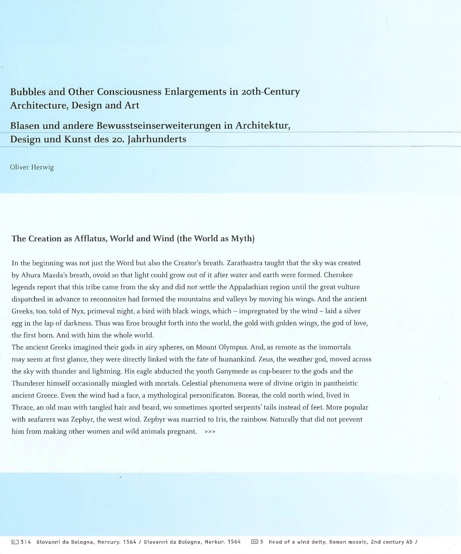What is air? You don't think about air or even perceive it unless it has changed from its usual state. Air, that most ubiquitous of the four elements, was long the most inexplicable enigma, peopled by gods and their messengers, venerated as the abode of spirits or demons. Nowadays air has been 'deconsecrated' and almost entirely demystified by science. Its availability is crucial; it envelops us and our planet - allows us to breathe and is anything but something to be taken for granted. The book addresses the question of what air is and approaches answering it from two angles. First, through a scientific explanation of its chemical and physical elements, their properties and the effect they have on our immediate environment. In parallel, air is traced as a phenomenon dealt with in art, architecture and design, all of which perceive, represent and creatively use air as a medium in entirely different ways. The focus is on the twentieth century to the present day. The juxtaposition of art, architecture, design, and science generates an exciting dialogue on air. An imaginative experiment intended to stimulate all those who are seriously concerned about air as an element vital to our survival.