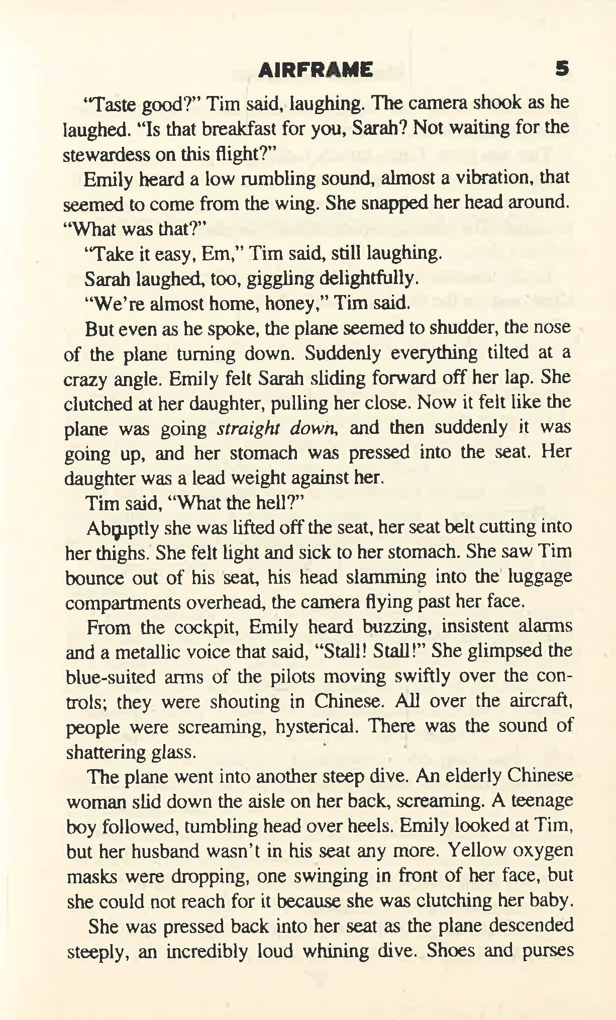Airframe remains one of Crichton's few novels not adapted to film. Crichton stated this was due to the great expense needed to make such a film. Another consideration might be that the novel is so dense with technical references that it reads more like an accident investigation report than a suspense-filled page-turner for the general reader. Airframe is unlike many of Crichton's other works in that the story has almost no outright science fiction elements.