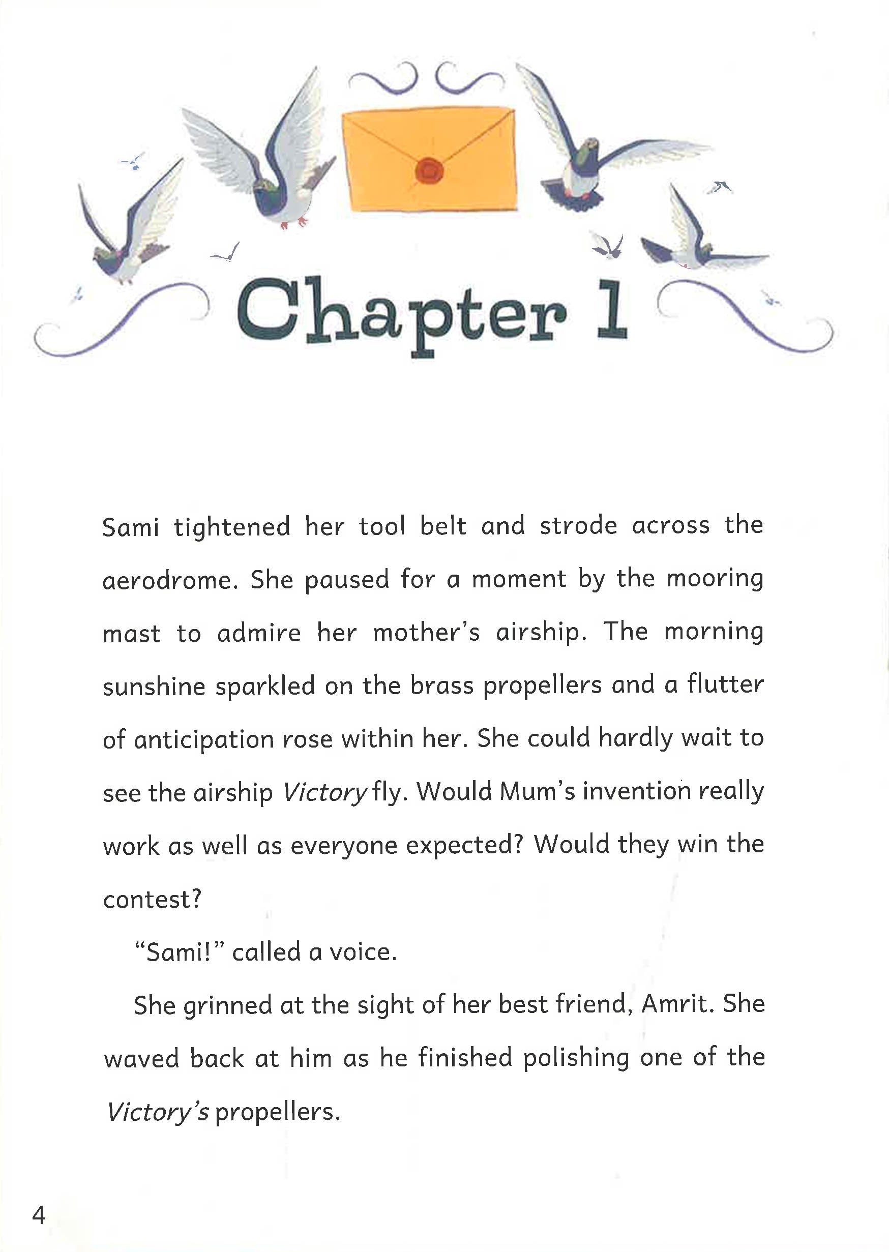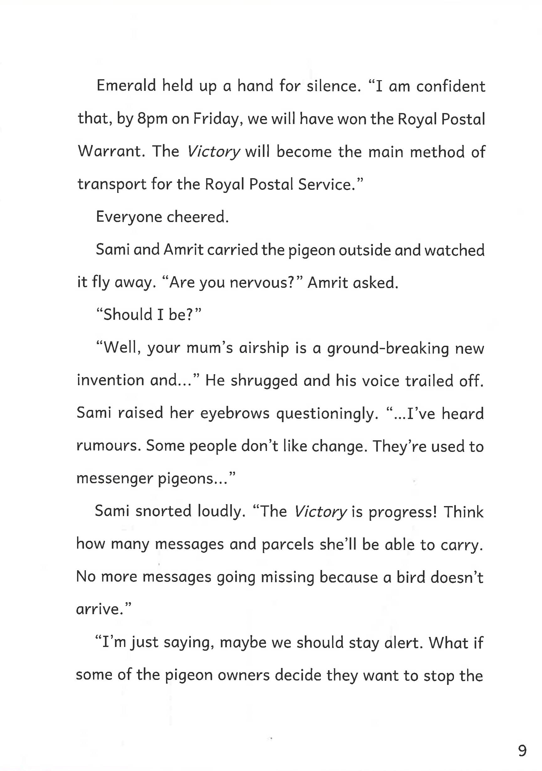 The maiden voyage of a newly built airship the Victory is only a week away. It shall fly in a competition to win the Royal Postal Warrant, to deliver all the land's post. But Sami, the daughter of the inventor and captain, discovers a plot to sabotage its journey. Teaming up with her friend Amrit, can they foil the plot in time to still win the race?