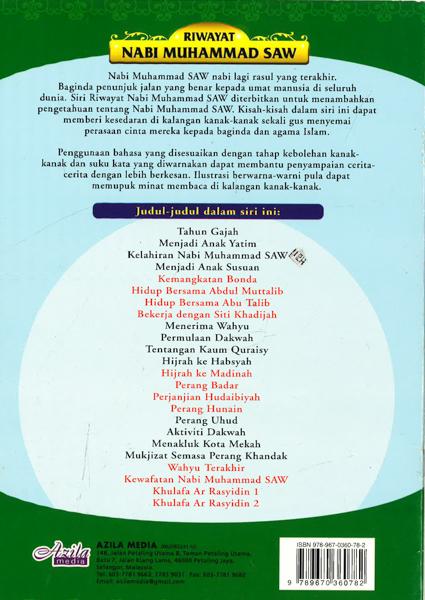Nabi Muhammad SAW nabi lagi rasul yang terakhir. Baginda penunjuk jalan yang benar kepada umat manusia di seluruh dunia. Siri Riwayat Nabi Muhammad SAW diterbitkan untuk menambahkan pengetahuan tentang Nabi Muhammad SAW. Kisah-kisah dalam siri ini dapat memberi kesedaran di kalangan kanak-kanak sekali gus menyemai perasaan cinta mereka kepada baginda dan agama Islam. Penggunaan bahasa yang disesuaikan dengan tahap kebolehan kanak kanak dan suku kata yang diwarnakan dapat membantu penyampaian cerita cerita dengan lebih berkesan. Ilustrasi berwarna-warni pula dapat memupuk minat membaca di kalangan kanak-kanak.