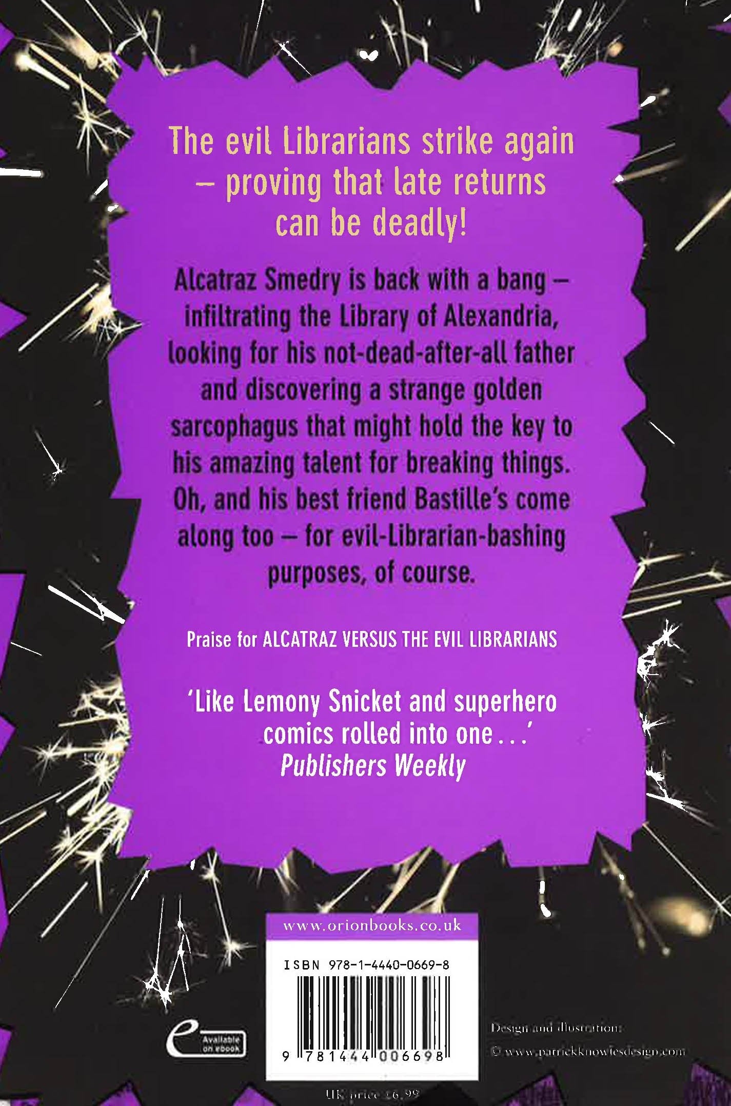 The evil Librarians strike again - proving that late returns can be deadly!Alcatraz Smedry is back with a bang - infiltrating the Library of Alexandria, looking for his not-dead-after-all father and discovering a strange golden sarcophagus that might hold the key to his amazing talent for breaking things. Oh, and his best friend Bastille's come along too - for evil-Librarian-bashing purposes, of course.
