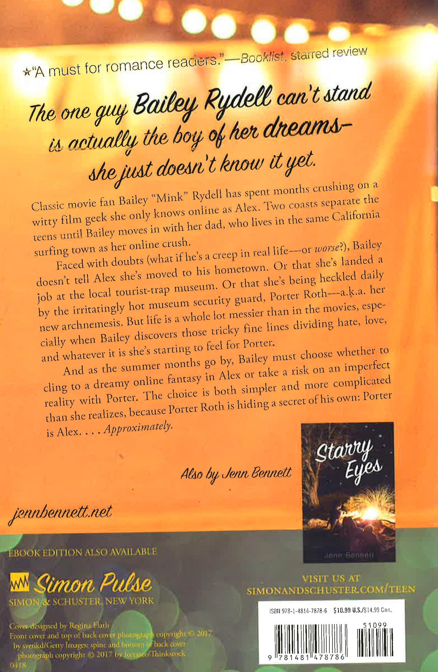 Classic movie buff Bailey “Mink” Rydell has spent months crushing on a witty film geek she only knows online by “Alex.” Two coasts separate the teens until Bailey moves in with her dad, who lives in the same California surfing town as her online crush.Faced with doubts (what if he’s a creep in real life - or worse?), Bailey doesn’t tell Alex she’s moved to his hometown. Or that she’s landed a job at the local tourist-trap museum. Or that she’s being heckled daily by the irritatingly hot museum security guard, Porter Roth - a.k.a. her new arch-nemesis. But life is whole lot messier than the movies, especially when Bailey discovers that tricky fine line between hate, love, and whatever-it-is she’s starting to feel for Porter.And as the summer months go by, Bailey must choose whether to cling to a dreamy online fantasy in Alex or take a risk on an imperfect reality with Porter. The choice is both simpler and more complicated than she realizes, because Porter Roth is hiding a secret of his own: Porter is Alex . . .