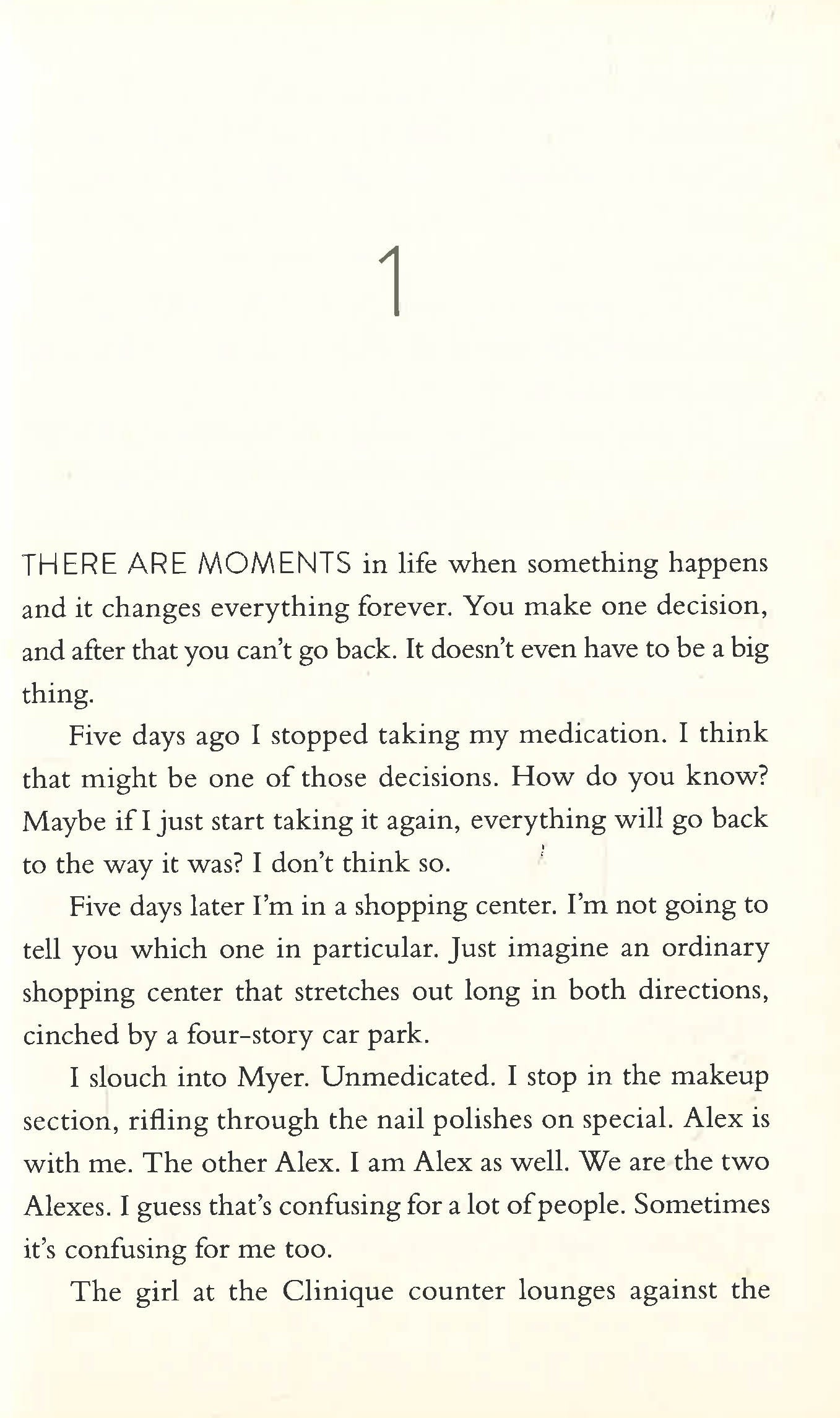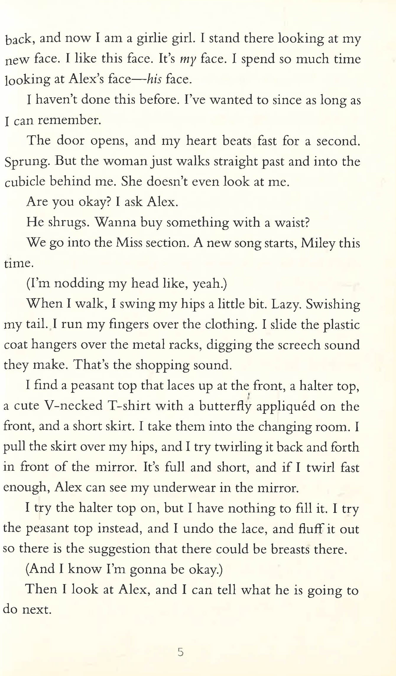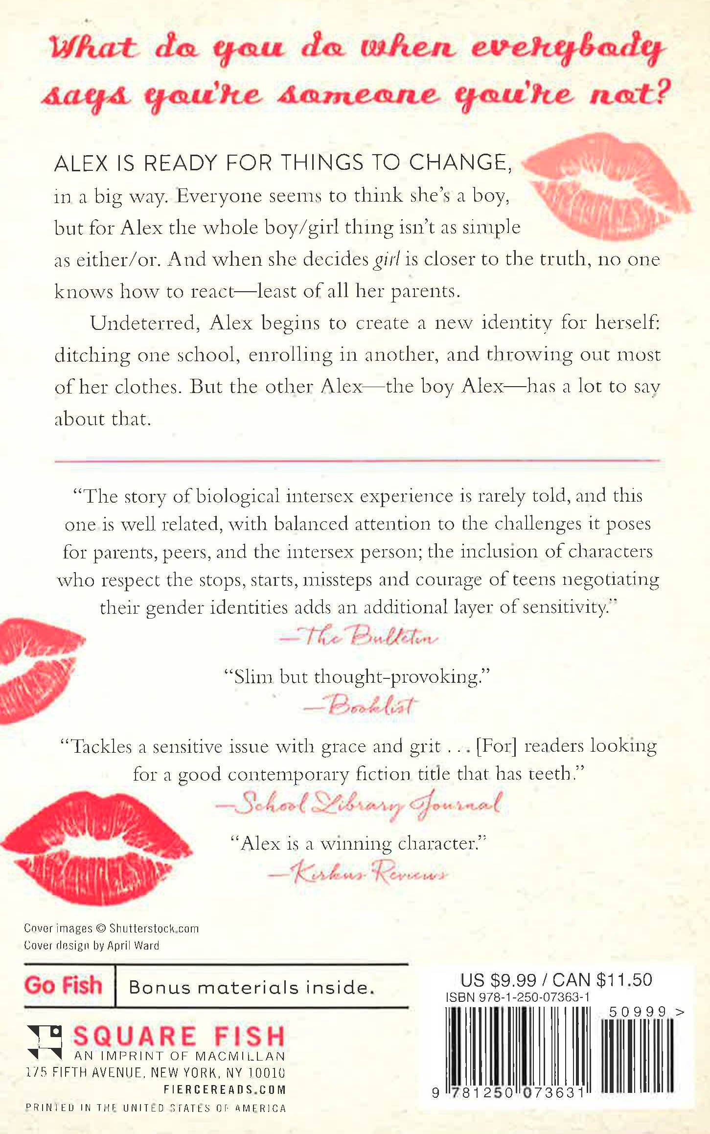 Alex is ready for things to change, in a big way. Everyone seems to think she's a boy, but for Alex the whole boy/girl thing isn't as simple as either/or, and when she decides girl is closer to the truth, no one knows how to react, least of all her parents. Undeterred, Alex begins to create a new identity for herself: ditching one school, enrolling in another, and throwing out most of her clothes. But the other Alex-the boy Alex-has a lot to say about that.