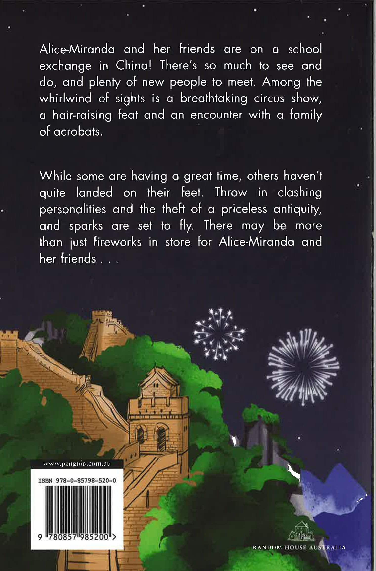 Alice-Miranda and her friends are on a school exchange in China! There's so much to see and do, and plenty of new people to meet. Among the whirlwind of sights is a breathtaking circus show, a hair-raising feat and an encounter with a family of acrobats.