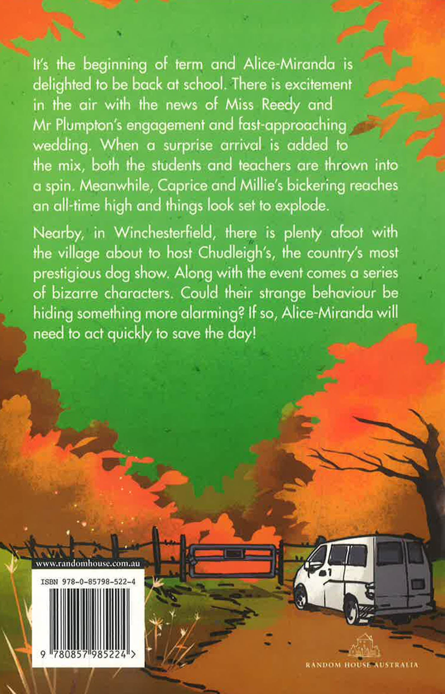 It's the start of term at Winchesterfield-Downsfordvale, and Alice-Miranda and her friends are over the moon to learn about one of the school's new charity projects--they are going to become the proud carers of a dog rescued from a nearby pound! To add to the excitement, there are whispers of a wedding between their two favorite teachers. Meanwhile, the local village is about to host the country's largest dog show--however, at the last moment the grounds are deemed unfit for competition. The school is called upon as a replacement venue, and preparations head into overdrive. Along with the dog show come a number of bizarre characters--some are strange, while some are just downright unpleasant. While walking the school's new dog, Alice-Miranda and Millie stumble upon something very worrying and will have to act fast in order to save the day!