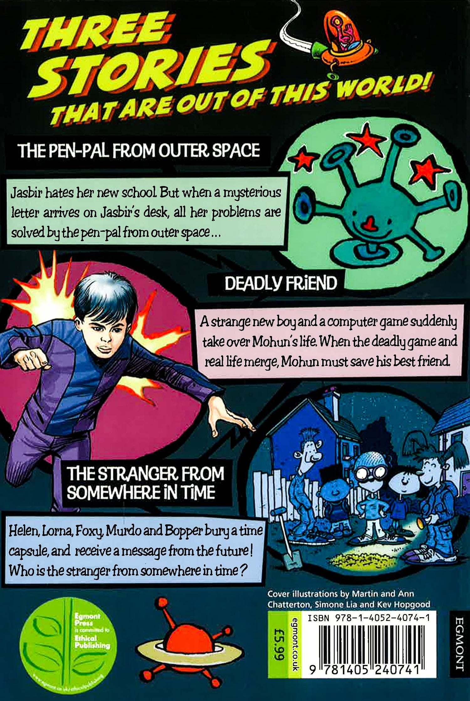 This book includes three alien adventures - not for the faint-hearted: "The Stranger from Somewhere in Time" by Sam McBratney: Helen, Lorna, Foxy, Murdo and Bopper bury a time capsule, without really expecting anything to happen. So imagine their surprise when they receive a message from the future! Who is the stranger from somewhere in time? "Deadly Friend" by Jamila Gavin: A strange new boy at school and a new computer game suddenly take over Mohun's life. When the deadly game and real life merge, Mohun must save his best friend from annihilation; "The Pen-Pal from Outer Space" by Franzeska G. Ewart: Jasbir hates her new school. She can't find any friends and she's the only person without a pen-pal. But when a mysterious letter arrives on Jasbir's desk, all her problems are solved by the pen-pal from outer space.