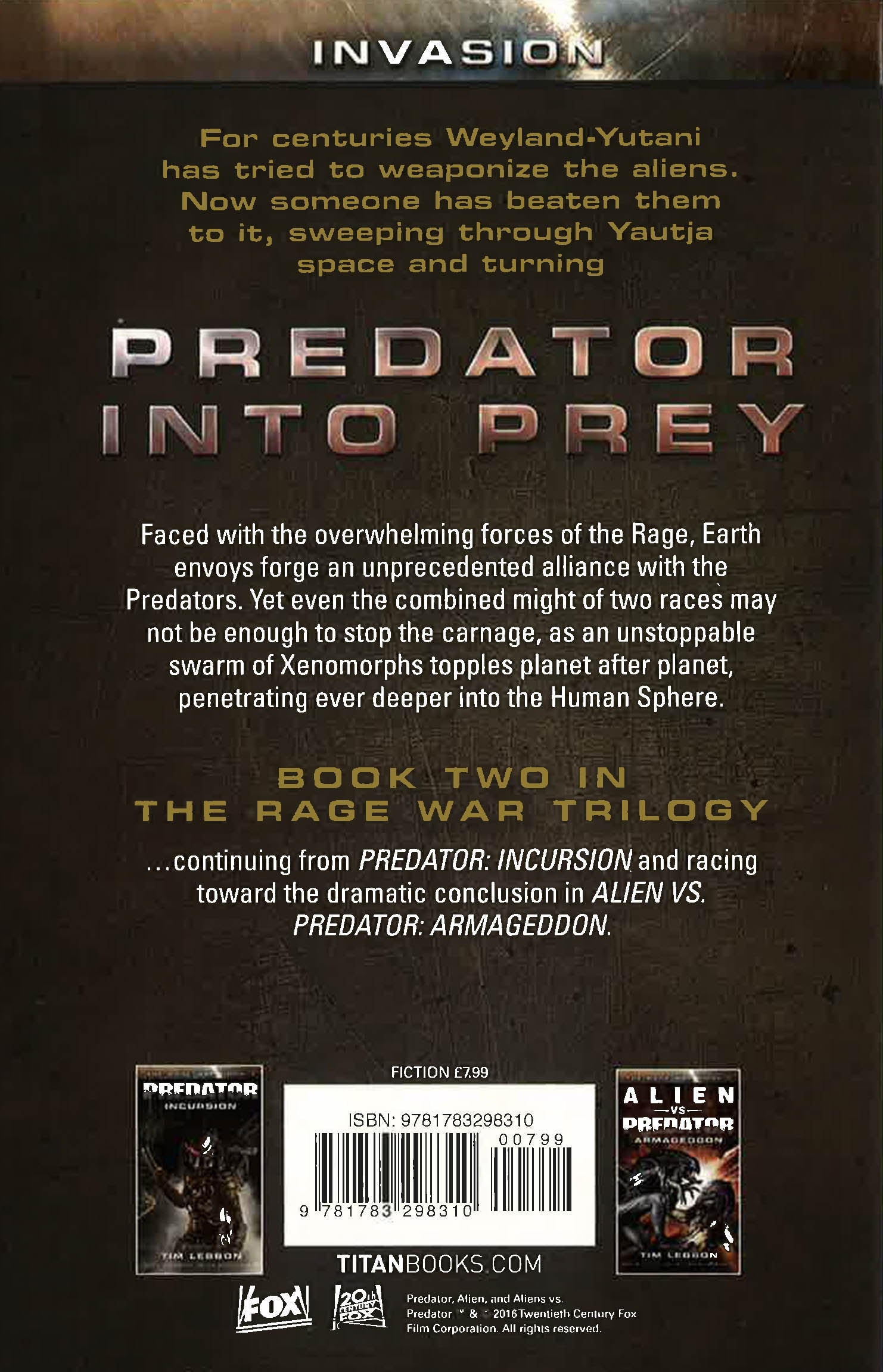 The second original novel in an Alien vs Predator "Rage War" series, continuing from Predator: Incursion as Colonial Marines units are being wiped out-and not by the Predators. This is an attack by organized armies of Aliens.