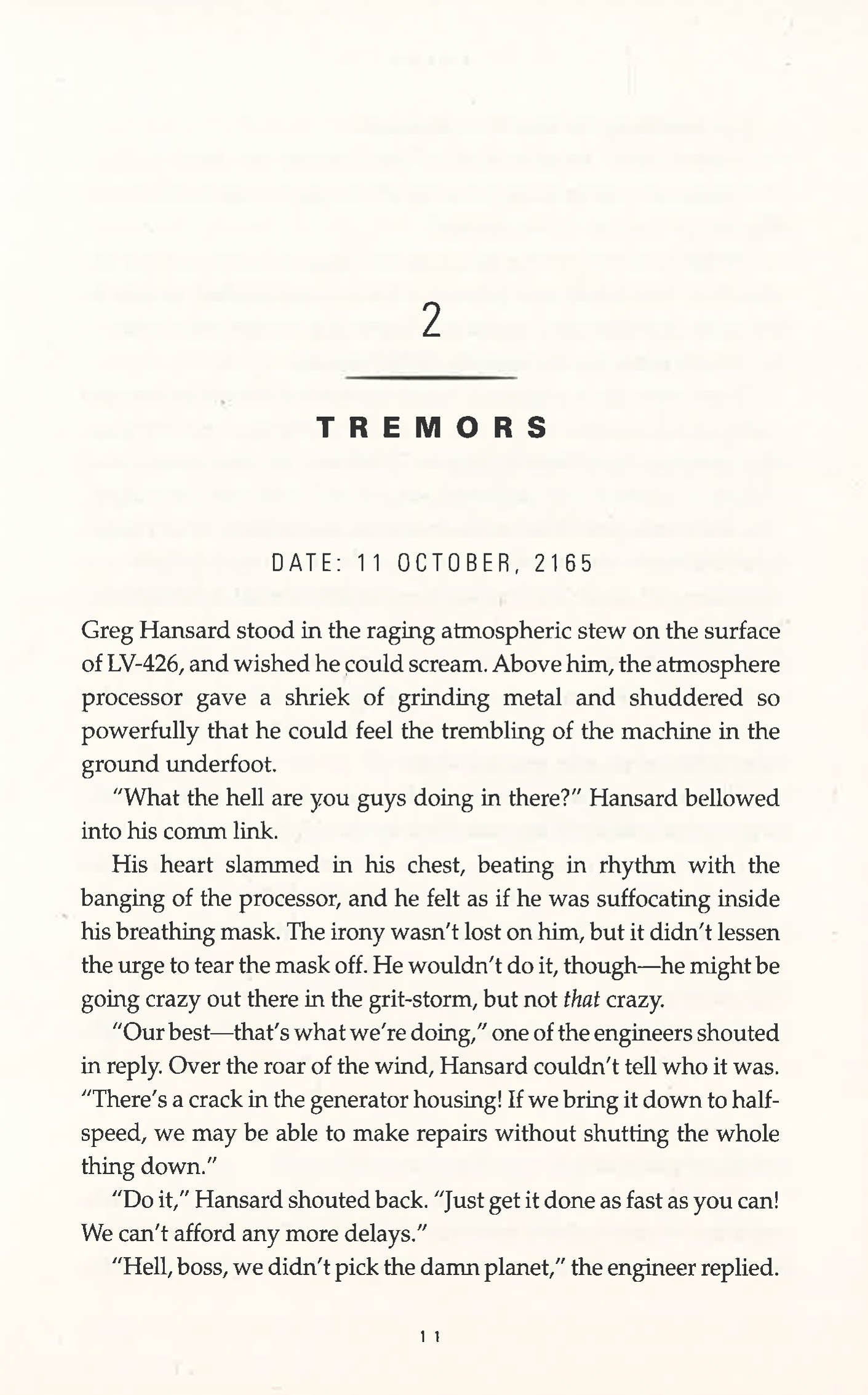 When Ellen Ripley finally returns to Earth, she learns that the planet LV-426 now called Acheron has been colonized. But LV-426 is where Ripley and the crew of the Nostromo found the original Xenomorph the killing machine known as the Alien. Protected by the Colonial Marines, the colonists seek to terraform the storm-swept planet. Two such residents are Anne and Russell Jorden, seeking a fortune that eluded them on Earth. On Acheron, Anne gives birth to the colony's first newborn. Rebecca Jorden, also known as Newt. The wildcatters discover a vast, decaying spaceship. The horseshoe-shaped vessel is of particular interest to Weyland Yutani, and may be the answer to their dreams. But what Anne and Russ find on board proves to be the stuff, not of dreams, but of nightmares.