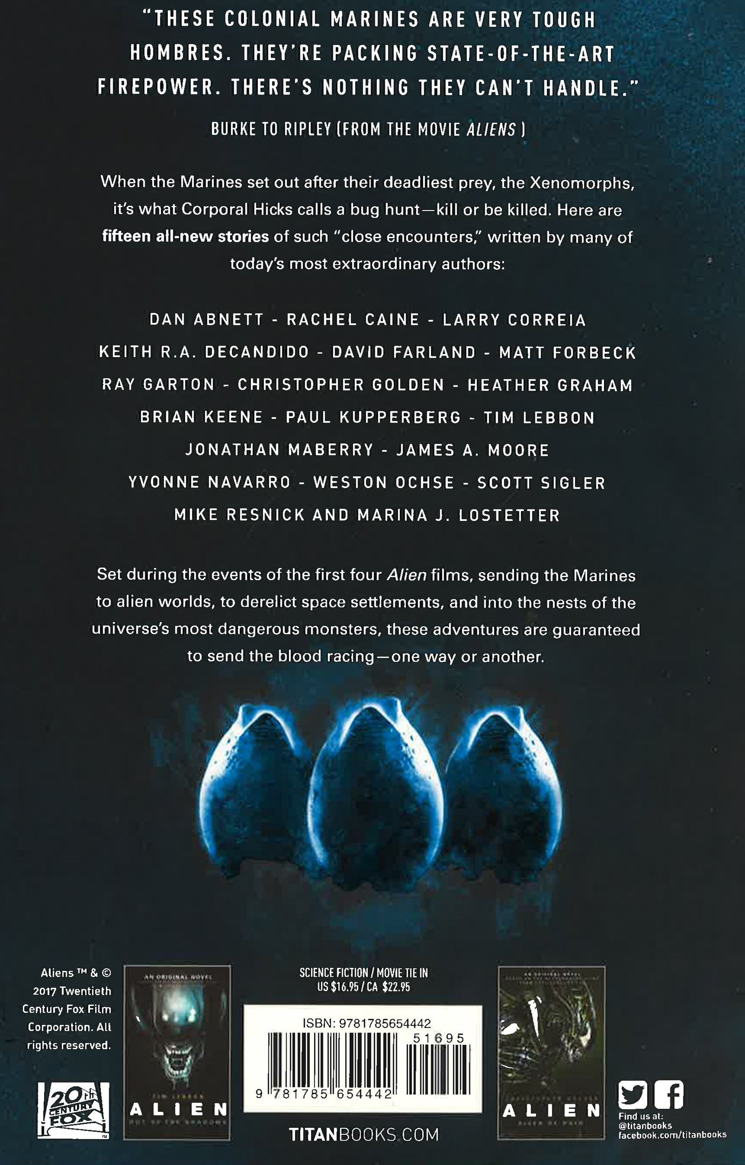 When the Colonial Marines set out after their deadliest prey, the Xenomorphs, it’s what Corporal Hicks calls a bug hunt - kill or be killed. Here are fifteen all-new stories of such “close encounters,” written by many of today’s most extraordinary authors. Set during the events of all four Alien™ films, sending the Marines to alien worlds, to derelict space settlements, and into the nests of the universe’s most dangerous monsters, these adventures are guaranteed to send the blood racing . . . One way or another.